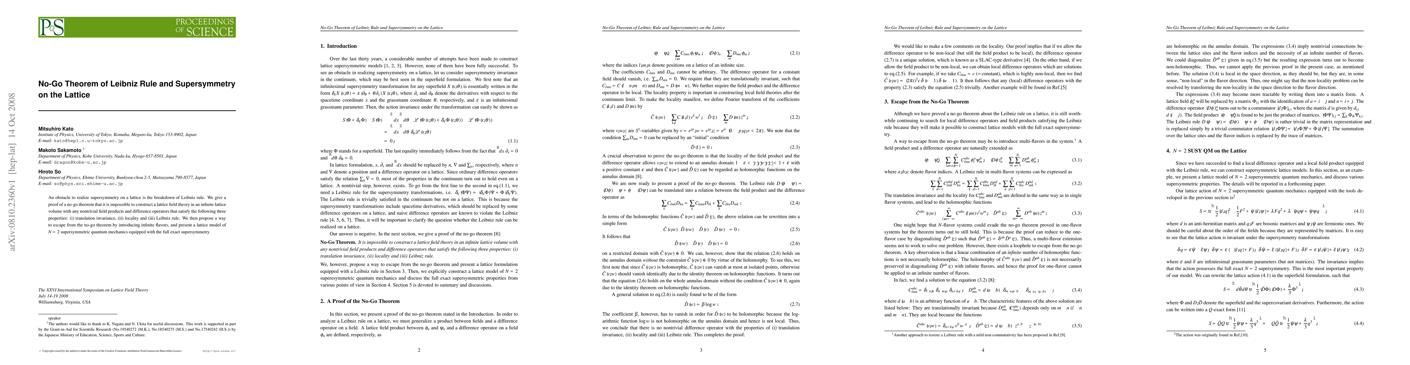 This paper proves a no-go theorem demonstrating that it's impossible to construct a lattice field theory with translation invariance, locality, and Leibniz rule. It proposes a method to bypass this theorem by introducing infinite flavors, presenting a lattice model of N=2 supersymmetric quantum mechanics with full exact supersymmetry.