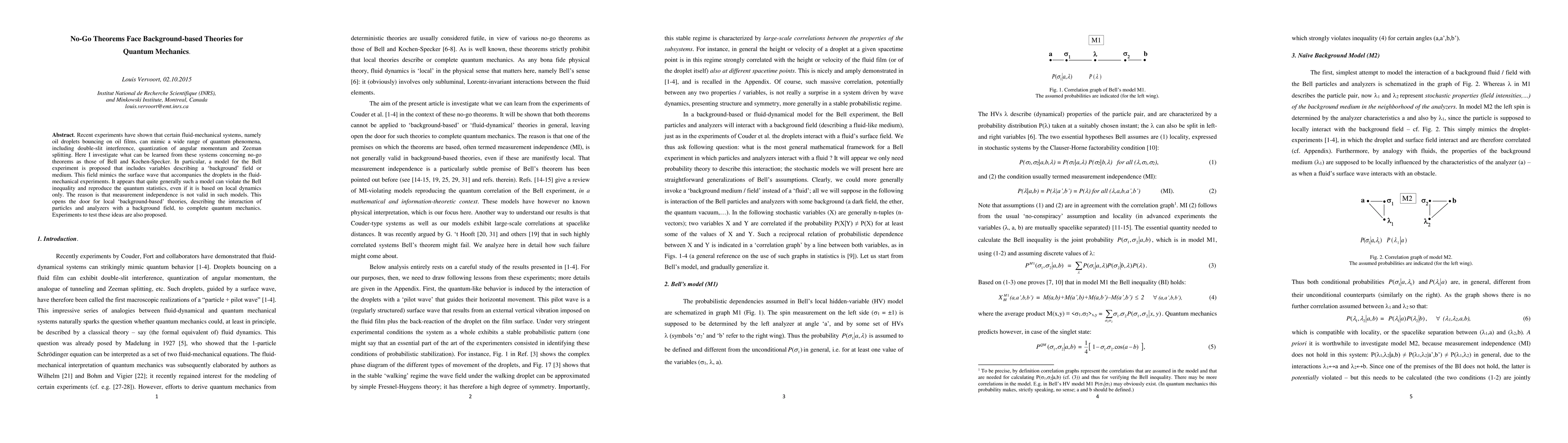 Recent experiments have shown that certain fluid-mechanical systems, namely oil droplets bouncing on oil films, can mimic a wide range of quantum phenomena, including double-slit interference, quantization of angular momentum and Zeeman splitting. Here I investigate what can be learned from these systems concerning no-go theorems as those of Bell and Kochen-Specker. In particular, a model for the Bell experiment is proposed that includes variables describing a 'background' field or medium. This field mimics the surface wave that accompanies the droplets in the fluid-mechanical experiments. It appears that quite generally such a model can violate the Bell inequality and reproduce the quantum statistics, even if it is based on local dynamics only. The reason is that measurement independence is not valid in such models. This opens the door for local 'background-based' theories, describing the interaction of particles and analyzers with a background field, to complete quantum mechanics. Experiments to test these ideas are also proposed.