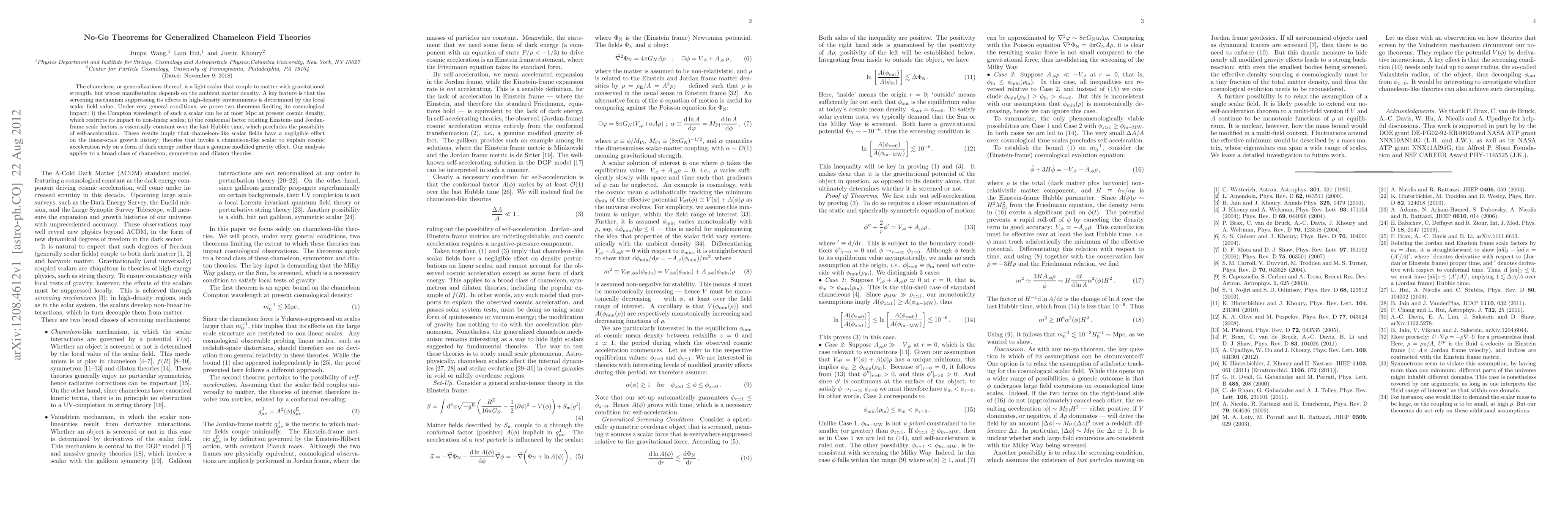 This paper proves two no-go theorems for generalized chameleon field theories, showing that such fields have negligible effects on linear-scale growth history. The theorems restrict the Compton wavelength to Mpc and demonstrate that the conformal factor remains constant over the last Hubble time, ruling out self-acceleration and implying these theories act more like dark energy than modified gravity.