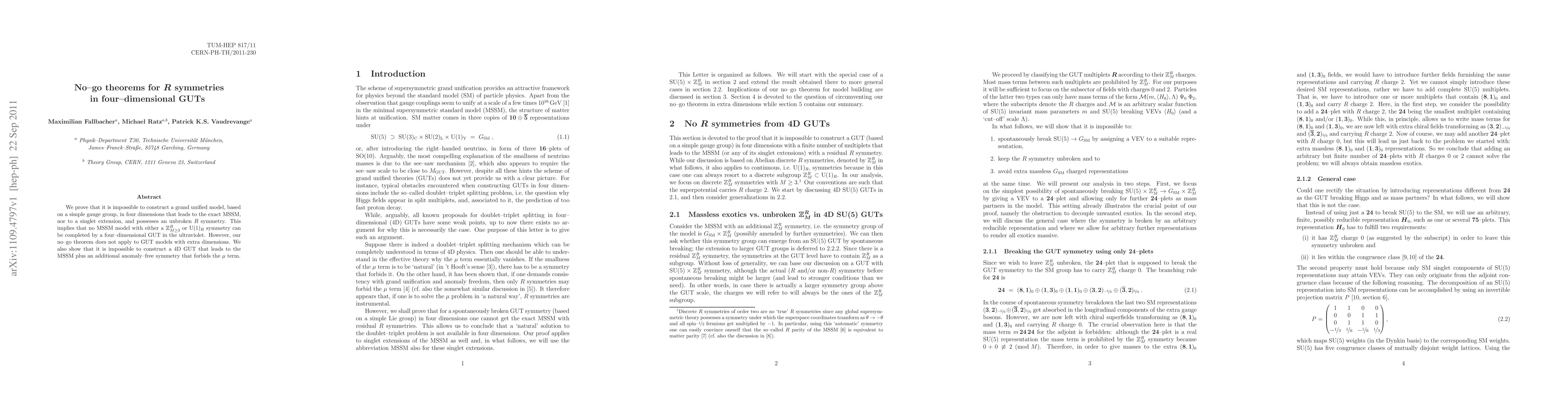 This paper proves that four-dimensional grand unified models cannot yield the exact Minimal Supersymmetric Standard Model (MSSM) or its singlet extensions while maintaining an unbroken R symmetry. It concludes that no MSSM model with specific R symmetries can be completed by a four-dimensional GUT, though extra-dimensional extensions may still be possible.