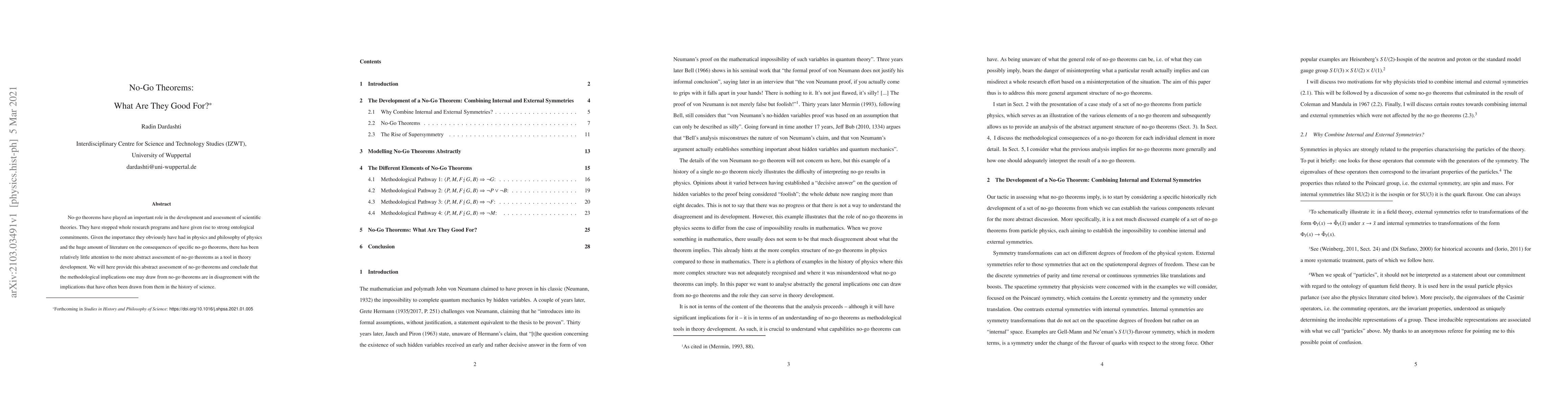 This paper provides an abstract assessment of no-go theorems, concluding that their methodological implications often conflict with the historical implications drawn from them in the development and assessment of scientific theories.