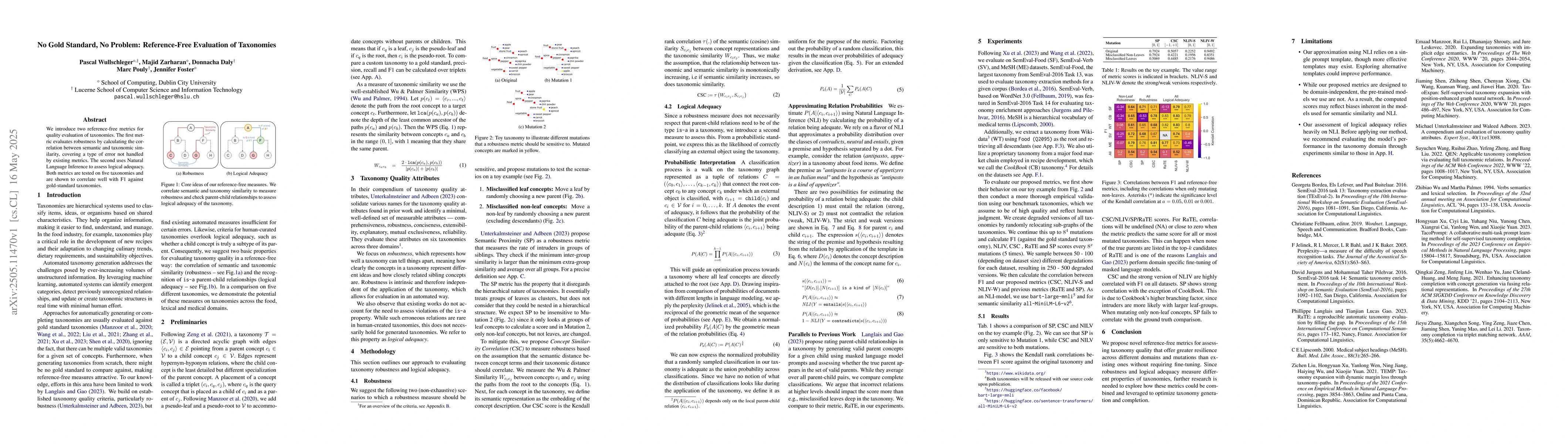 The paper presents novel reference-free metrics for taxonomy evaluation, combining semantic-taxonomic similarity and Natural Language Inference approaches.