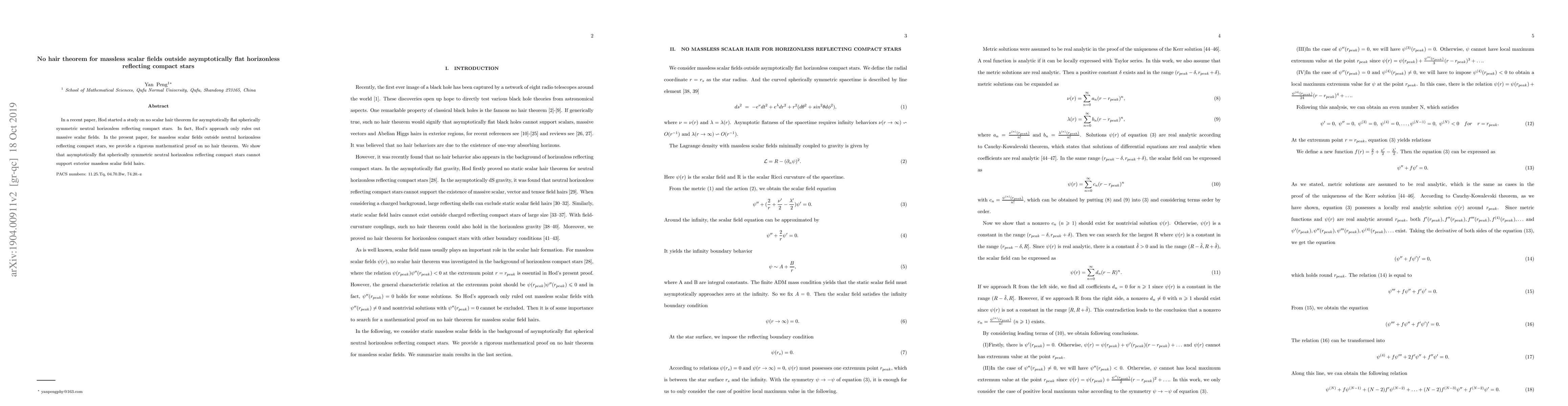 In a recent paper, Hod started a study on no scalar hair theorem for asymptotically flat spherically symmetric neutral horizonless reflecting compact stars. In fact, Hod's approach only rules out massive scalar fields. In the present paper, for massless scalar fields outside neutral horizonless reflecting compact stars, we provide a rigorous mathematical proof on no hair theorem. We show that asymptotically flat spherically symmetric neutral horizonless reflecting compact stars cannot support exterior massless scalar field hairs.