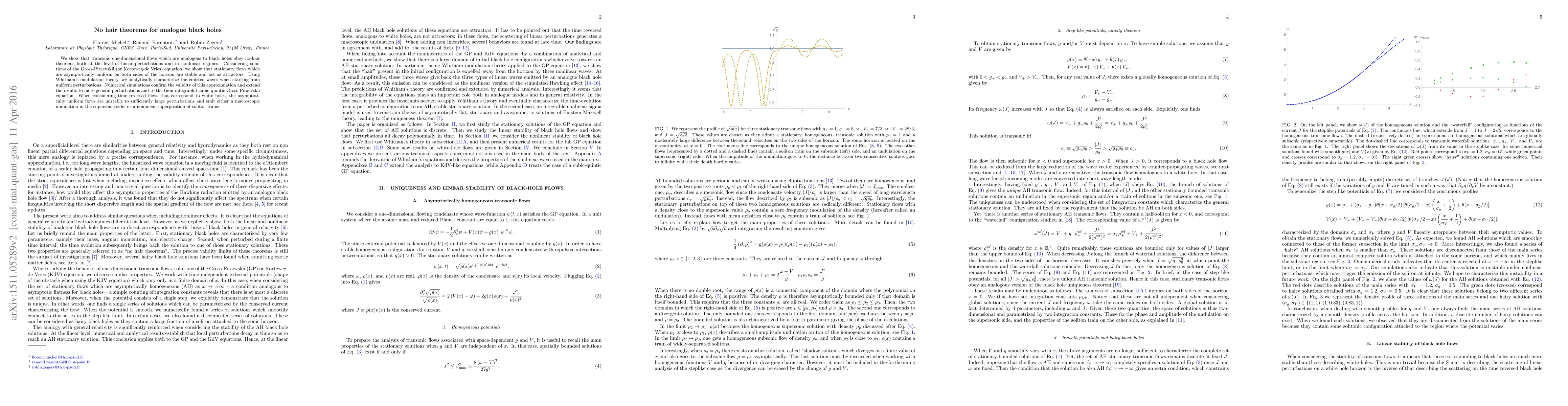 This paper demonstrates that transonic flows mimicking black holes adhere to no-hair theorems, showing stability in linear and non-linear perturbations. Numerical simulations validate these findings and reveal instability in time-reversed white hole flows, leading to distinct wave emissions.