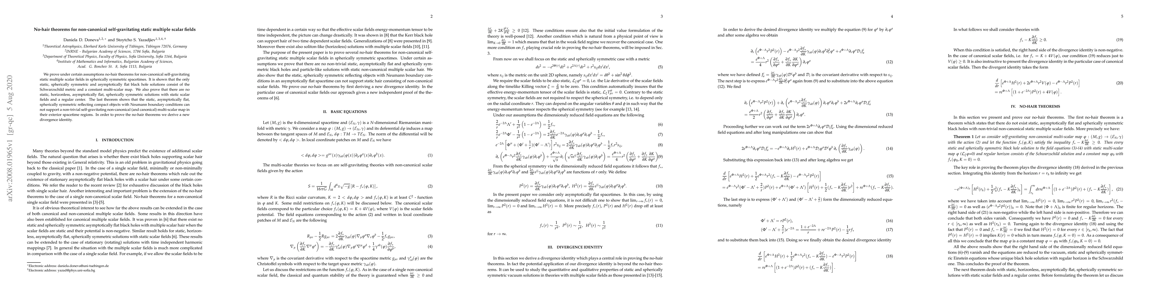 This paper proves no-hair theorems for non-canonical self-gravitating static multiple scalar fields, showing that only the Schwarzschild metric with a constant scalar field exists for such systems in spherically symmetric, asymptotically flat spacetimes. It also demonstrates the absence of horizonless, spherically symmetric solutions with static scalar fields and a regular center.