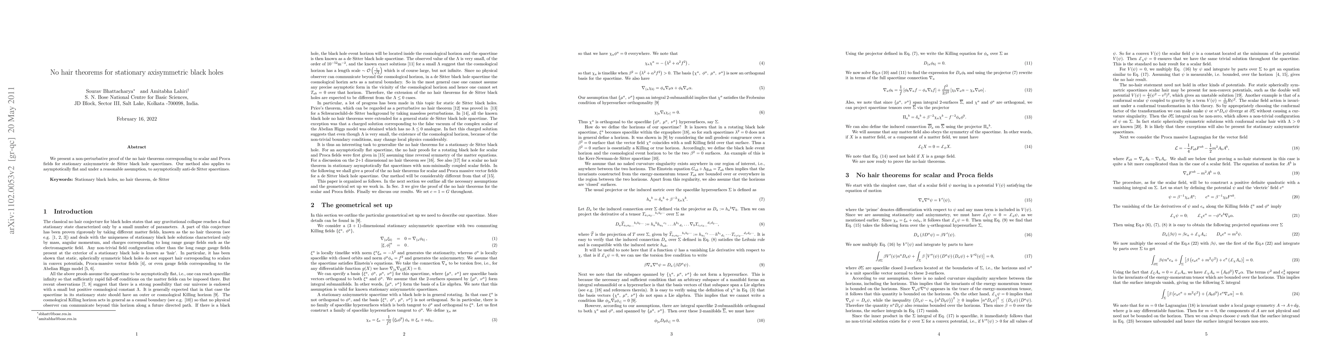 This paper provides a non-perturbative proof of the no hair theorems for scalar and Proca fields in stationary axisymmetric black hole spacetimes, including de Sitter, asymptotically flat, and potentially anti-de Sitter scenarios. The method used is broadly applicable across different spacetime types.