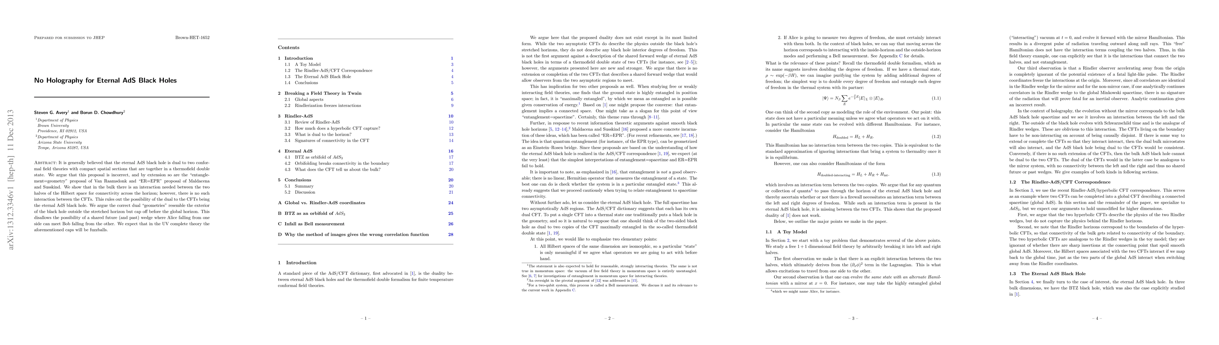 This paper argues against the holographic duality of eternal AdS black holes with two conformal field theories in a thermofield double state, refuting the "entanglement=geometry" and "ER=EPR" proposals. It posits that the correct dual "geometries" resemble the black hole's exterior but terminate before reaching the global horizon, thus prohibiting shared future and past regions.