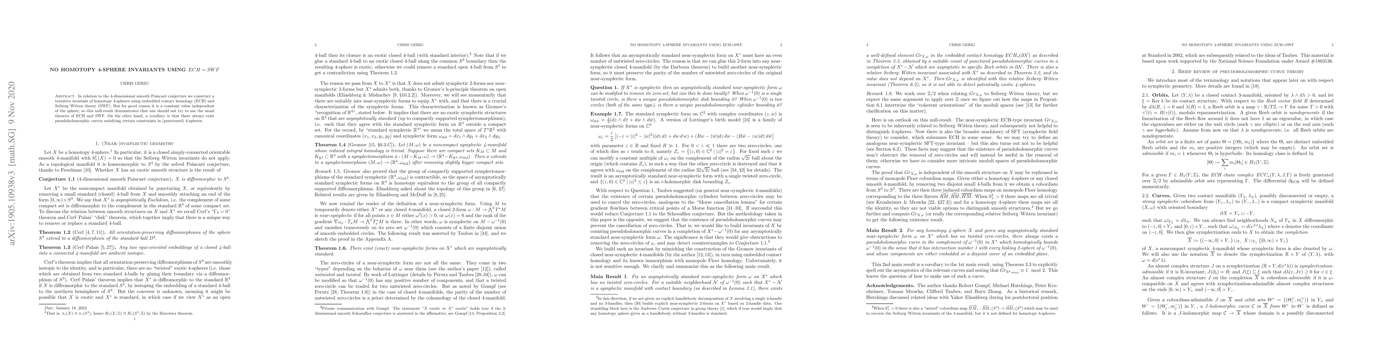 In relation to the 4-dimensional smooth Poincar\'e conjecture we construct a tentative invariant of homotopy 4-spheres using embedded contact homology (ECH) and Seiberg-Witten theory (SWF). But for good reason it is a constant value independent of the sphere, so this null-result demonstrates that one should not try to use the usual theories of ECH and SWF. On the other hand, a corollary is that there always exist pseudoholomorphic curves satisfying certain constraints in (punctured) 4-spheres.