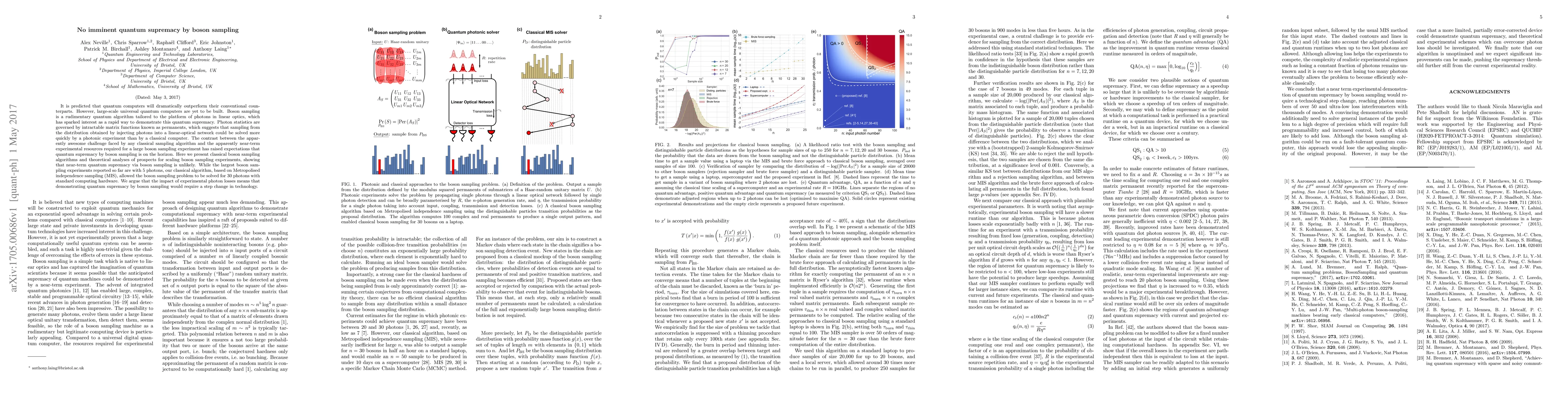 The paper argues that near-term quantum supremacy via boson sampling is unlikely due to the development of efficient classical algorithms and the significant technological advancements required to overcome experimental photon losses. The authors demonstrate that their classical algorithm can solve boson sampling problems for 30 photons, challenging the expectation of imminent quantum supremacy.