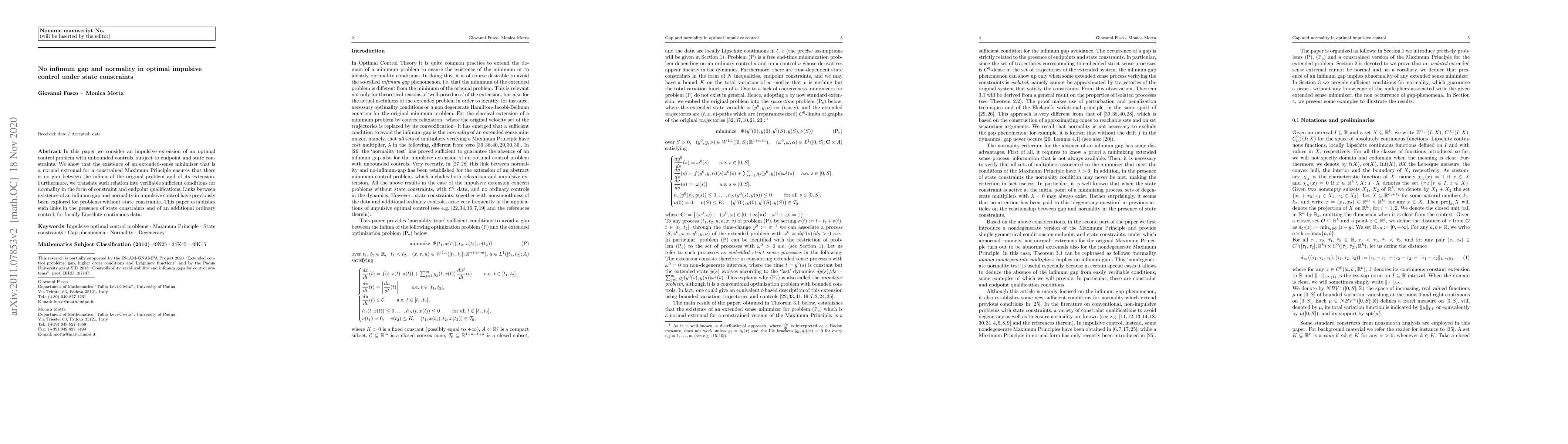 In this paper we consider an impulsive extension of an optimal control problem with unbounded controls, subject to endpoint and state constraints. We show that the existence of an extended-sense minimizer that is a normal extremal for a constrained Maximum Principle ensures that there is no gap between the infima of the original problem and of its extension. Furthermore, we translate such relation into verifiable sufficient conditions for normality in the form of constraint and endpoint qualifications. Links between existence of an infimum gap and normality in impulsive control have previously been explored for problems without state constraints. This paper establishes such links in the presence of state constraints and of an additional ordinary control, for locally Lipschitz continuous data.