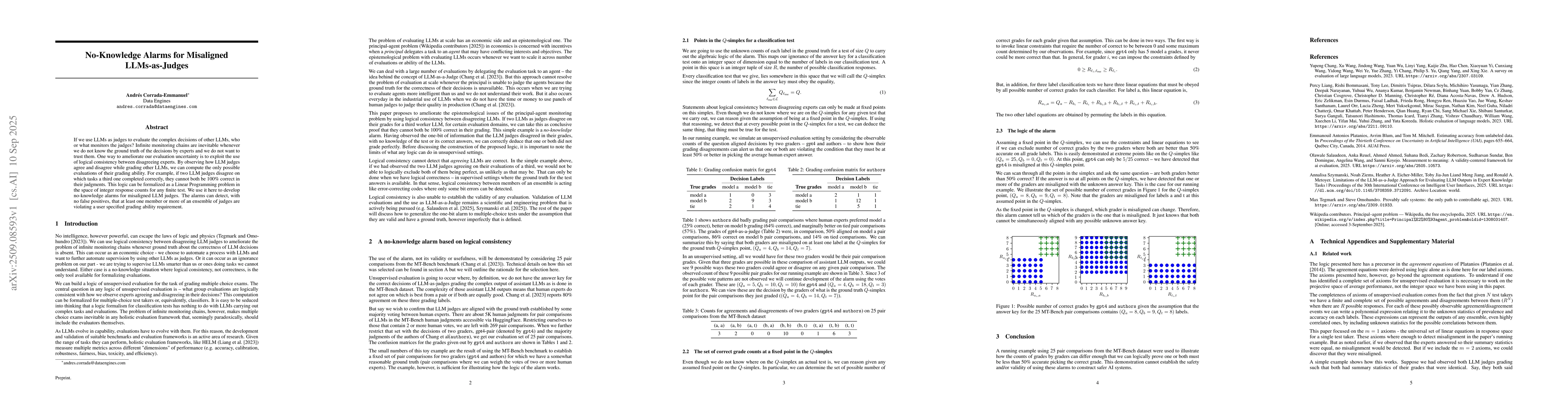 If we use LLMs as judges to evaluate the complex decisions of other LLMs, who or what monitors the judges? Infinite monitoring chains are inevitable whenever we do not know the ground truth of the decisions by experts and we do not want to trust them. One way to ameliorate our evaluation uncertainty is to exploit the use of logical consistency between disagreeing experts. By observing how LLM judges agree and disagree while grading other LLMs, we can compute the only possible evaluations of their grading ability. For example, if two LLM judges disagree on which tasks a third one completed correctly, they cannot both be 100\% correct in their judgments. This logic can be formalized as a Linear Programming problem in the space of integer response counts for any finite test. We use it here to develop no-knowledge alarms for misaligned LLM judges. The alarms can detect, with no false positives, that at least one member or more of an ensemble of judges are violating a user specified grading ability requirement.