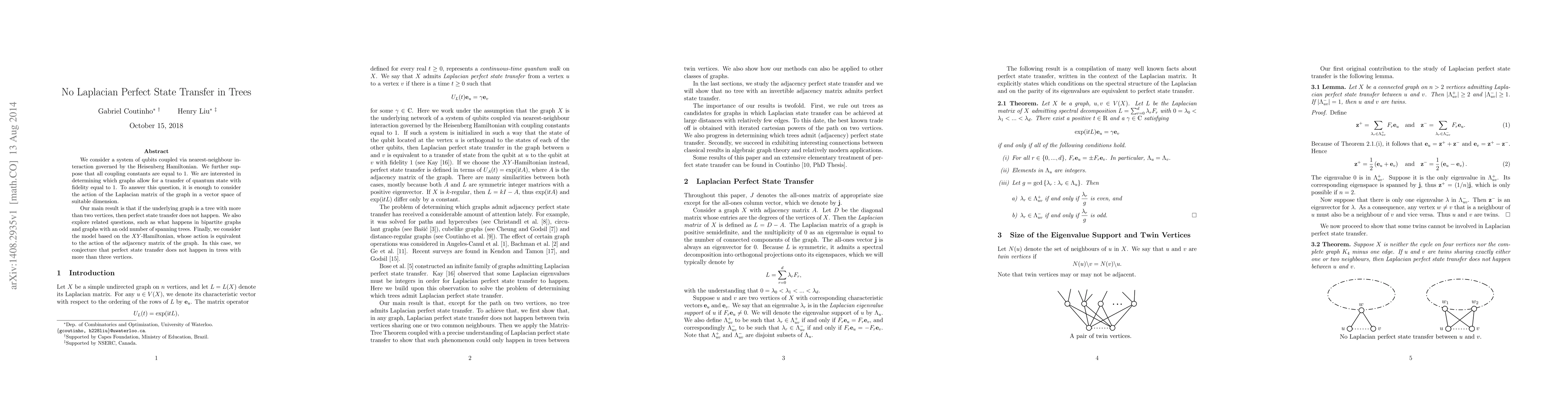 We consider a system of qubits coupled via nearest-neighbour interaction governed by the Heisenberg Hamiltonian. We further suppose that all coupling constants are equal to $1$. We are interested in determining which graphs allow for a transfer of quantum state with fidelity equal to $1$. To answer this question, it is enough to consider the action of the Laplacian matrix of the graph in a vector space of suitable dimension. Our main result is that if the underlying graph is a tree with more than two vertices, then perfect state transfer does not happen. We also explore related questions, such as what happens in bipartite graphs and graphs with an odd number of spanning trees. Finally, we consider the model based on the $XY$-Hamiltonian, whose action is equivalent to the action of the adjacency matrix of the graph. In this case, we conjecture that perfect state transfer does not happen in trees with more than three vertices.