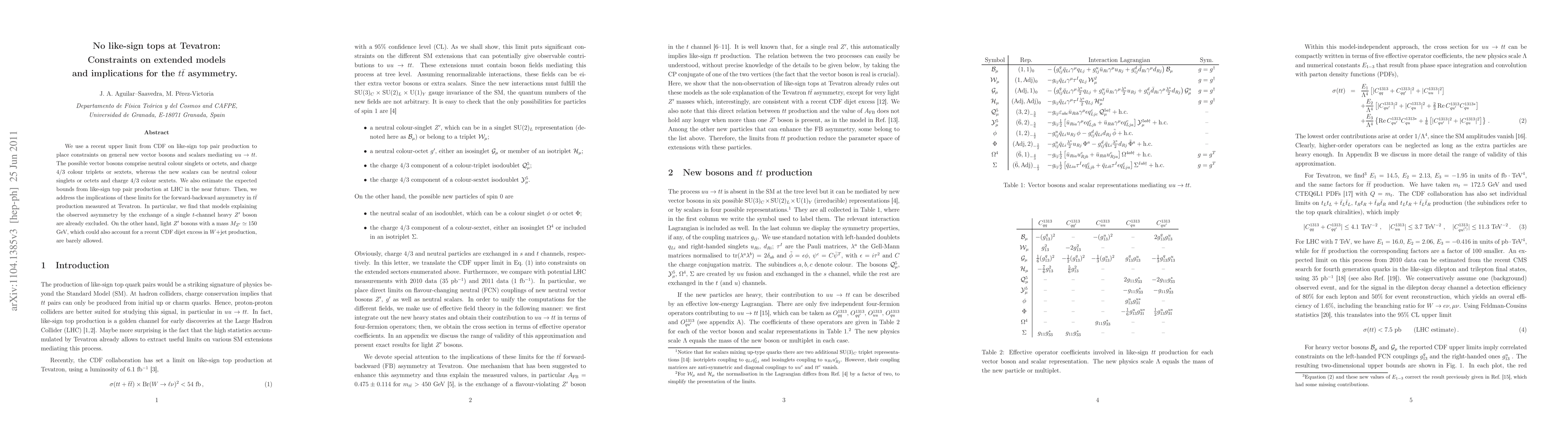 We use a recent upper limit from CDF on like-sign top pair production to place constraints on general new vector bosons and scalars mediating u u -> t t. The possible vector bosons comprise neutral colour singlets or octets, and charge 4/3 colour triplets or sextets, whereas the new scalars can be neutral colour singlets or octets and charge 4/3 colour sextets. We also estimate the expected bounds from like-sign top pair production at LHC in the near future. Then, we address the implications of these limits for the forward-backward asymmetry in t tbar production measured at Tevatron. In particular, we find that models explaining the observed asymmetry by the exchange of a single t-channel heavy Z' boson are already excluded. On the other hand, light Z' bosons with a mass M_Z' ~ 150 GeV, which could also account for a recent CDF dijet excess in W+jet production, are barely allowed.