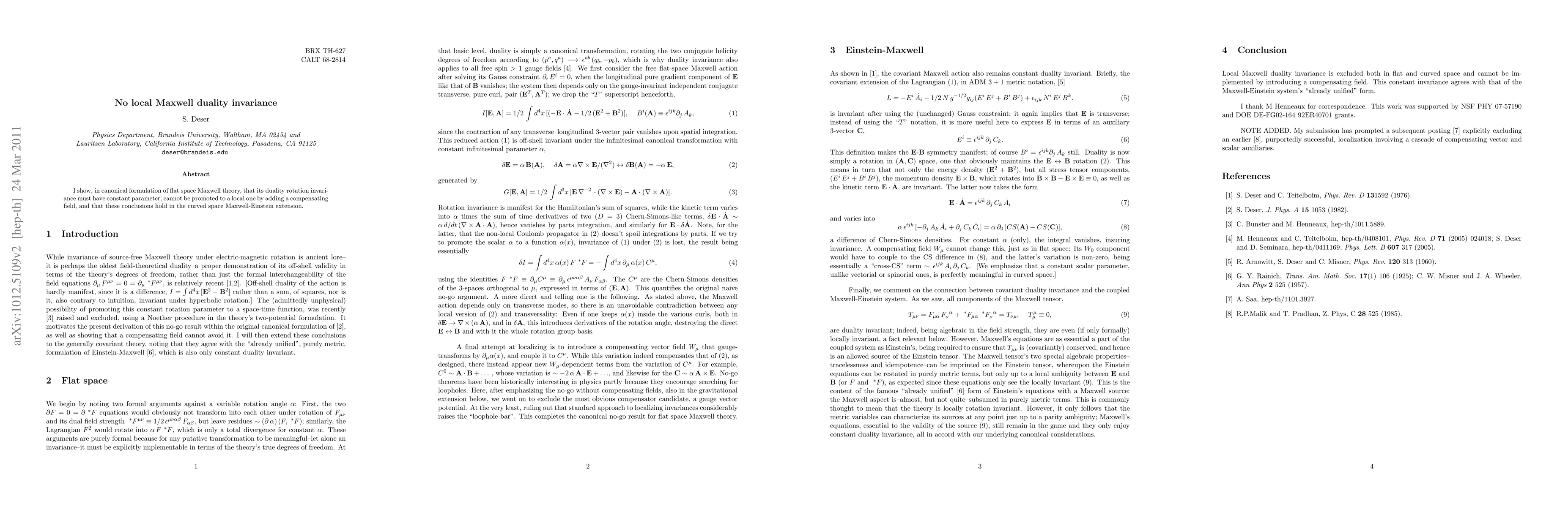 Summary: The paper demonstrates that the duality rotation invariance in Maxwell theory is fixed and cannot be made local, even when extending to Maxwell-Einstein theory in curved space. This invariance cannot be enhanced by introducing additional fields.
