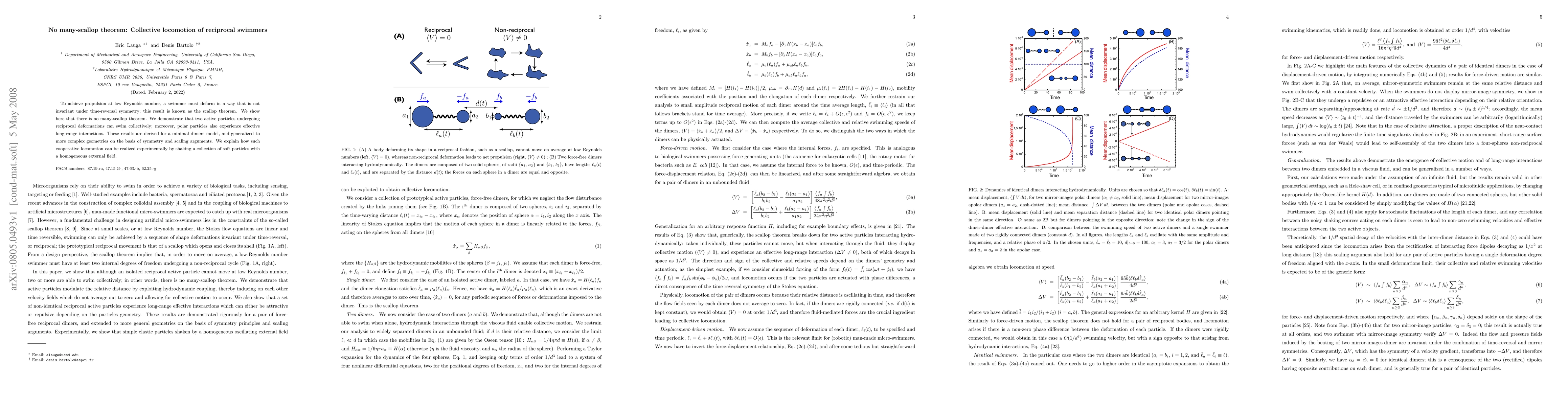 To achieve propulsion at low Reynolds number, a swimmer must deform in a way that is not invariant under time-reversal symmetry; this result is known as the scallop theorem. We show here that there is no many-scallop theorem. We demonstrate that two active particles undergoing reciprocal deformations can swim collectively; moreover, polar particles also experience effective long-range interactions. These results are derived for a minimal dimers model, and generalized to more complex geometries on the basis of symmetry and scaling arguments. We explain how such cooperative locomotion can be realized experimentally by shaking a collection of soft particles with a homogeneous external field.