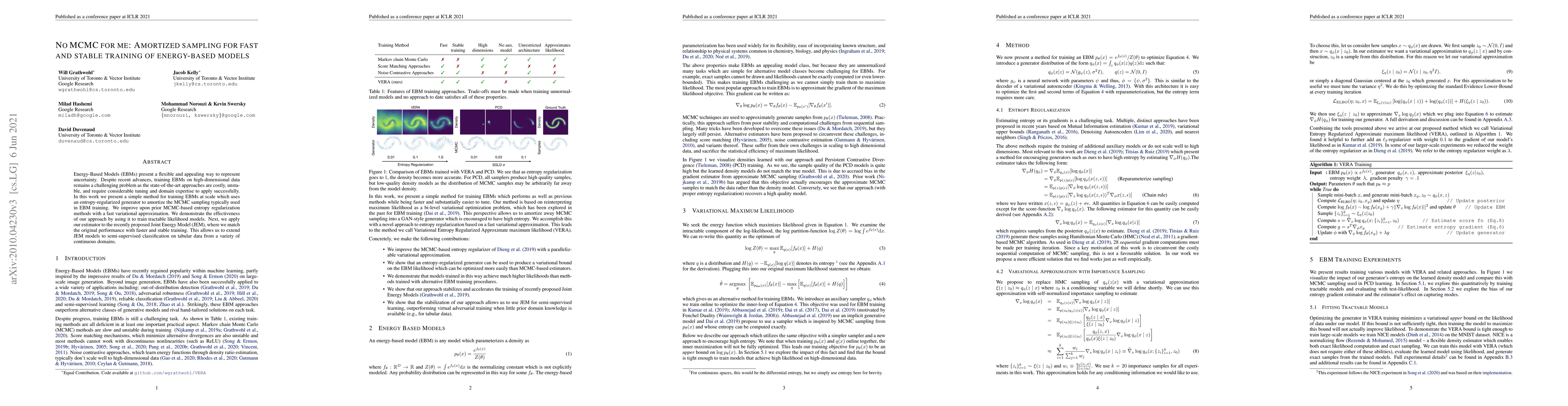 Energy-Based Models (EBMs) present a flexible and appealing way to represent uncertainty. Despite recent advances, training EBMs on high-dimensional data remains a challenging problem as the state-of-the-art approaches are costly, unstable, and require considerable tuning and domain expertise to apply successfully. In this work, we present a simple method for training EBMs at scale which uses an entropy-regularized generator to amortize the MCMC sampling typically used in EBM training. We improve upon prior MCMC-based entropy regularization methods with a fast variational approximation. We demonstrate the effectiveness of our approach by using it to train tractable likelihood models. Next, we apply our estimator to the recently proposed Joint Energy Model (JEM), where we match the original performance with faster and stable training. This allows us to extend JEM models to semi-supervised classification on tabular data from a variety of continuous domains.