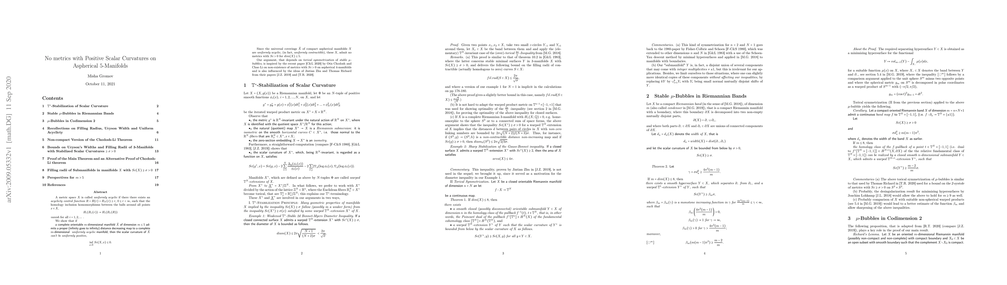 A metric space $X$ is called uniformly acyclic if there there exists an {\it acyclicty control function} $R=R(r)=R_X(r)\geq r $, $0\leq r <\infty$, such that the homology inclusion homomorphisms between the balls around all points $x\in X$, $$H_i(B_x(r))\to H_i(B_x(R))$$ vanish for all $i=1,2,\ldots$. We show that if a complete orientable $m$-dimensional manifold $\tilde X$ of dimension $m\leq 5$ admits a proper (infinity goes to infinity) distance decreasing map to a complete $m$-dimensional uniformly acyclic manifold, then the scalar curvature of $\tilde X$ can't be uniformly positive, $$\inf _{x\in \tilde X}Sc(X,x) \leq 0.$$ Since the universal coverings $\tilde X$ of compact aspherical manifolds $X$ are {\it uniformly acyclic}, (in fact, {\it uniformly contractible}), these $X$, admit no metrics with $Sc>0$ for $dim (X)\leq 5$. Our argument, that depends on {\it torical symmetrization} of {\it stable $\mu$-bubbles}, is inspired by the recent paper by Otis Chodosh and Chao Li on non-existence of metrics with $Sc>0$ on aspherical 4-manifolds and is also influenced by the ideas of Jintian Zhu and Thomas Richard.