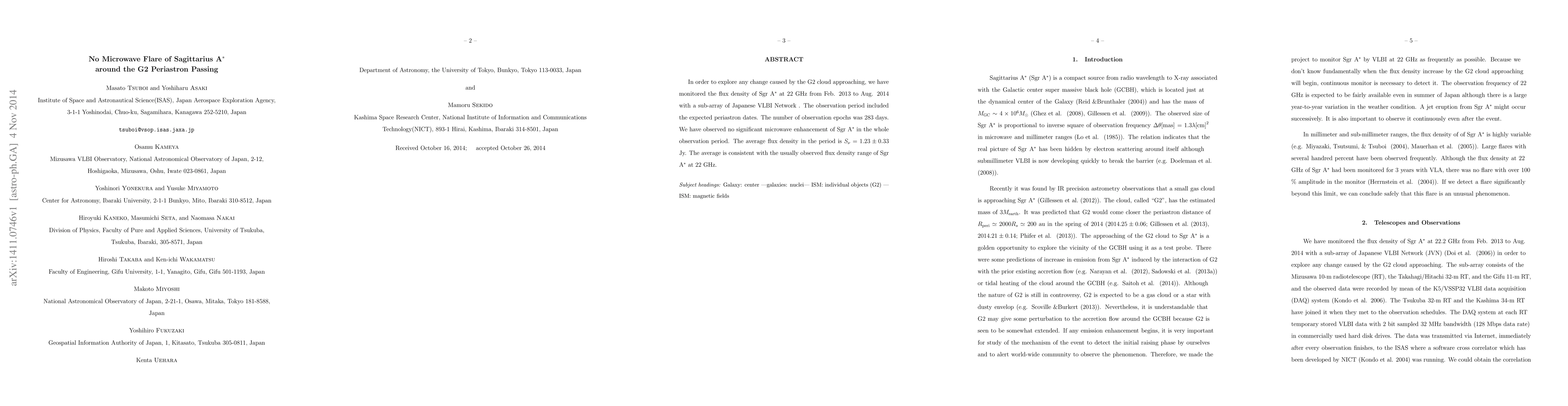 In order to explore any change caused by the G2 cloud approaching, we have monitored the flux density of Sgr A* at 22 GHz from Feb. 2013 to Aug. 2014 with a sub-array of Japanese VLBI Network . The observation period included the expected periastron dates. The number of observation epochs was 283 days. We have observed no significant microwave enhancement of Sgr A* in the whole observation period. The average flux density in the period is $S=1.23+/-0.33$ Jy. The average is consistent with the usually observed flux density range of Sgr A* at 22 GHz.