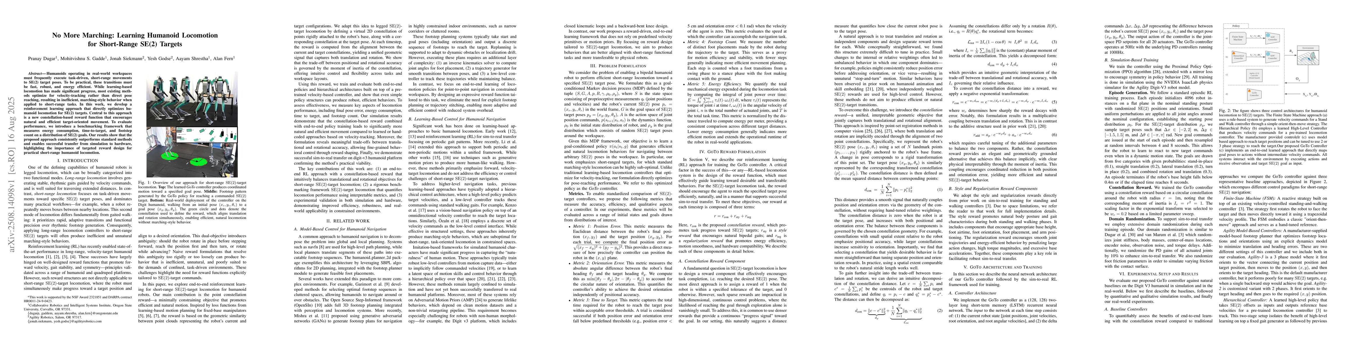 Humanoids operating in real-world workspaces must frequently execute task-driven, short-range movements to SE(2) target poses. To be practical, these transitions must be fast, robust, and energy efficient. While learning-based locomotion has made significant progress, most existing methods optimize for velocity-tracking rather than direct pose reaching, resulting in inefficient, marching-style behavior when applied to short-range tasks. In this work, we develop a reinforcement learning approach that directly optimizes humanoid locomotion for SE(2) targets. Central to this approach is a new constellation-based reward function that encourages natural and efficient target-oriented movement. To evaluate performance, we introduce a benchmarking framework that measures energy consumption, time-to-target, and footstep count on a distribution of SE(2) goals. Our results show that the proposed approach consistently outperforms standard methods and enables successful transfer from simulation to hardware, highlighting the importance of targeted reward design for practical short-range humanoid locomotion.