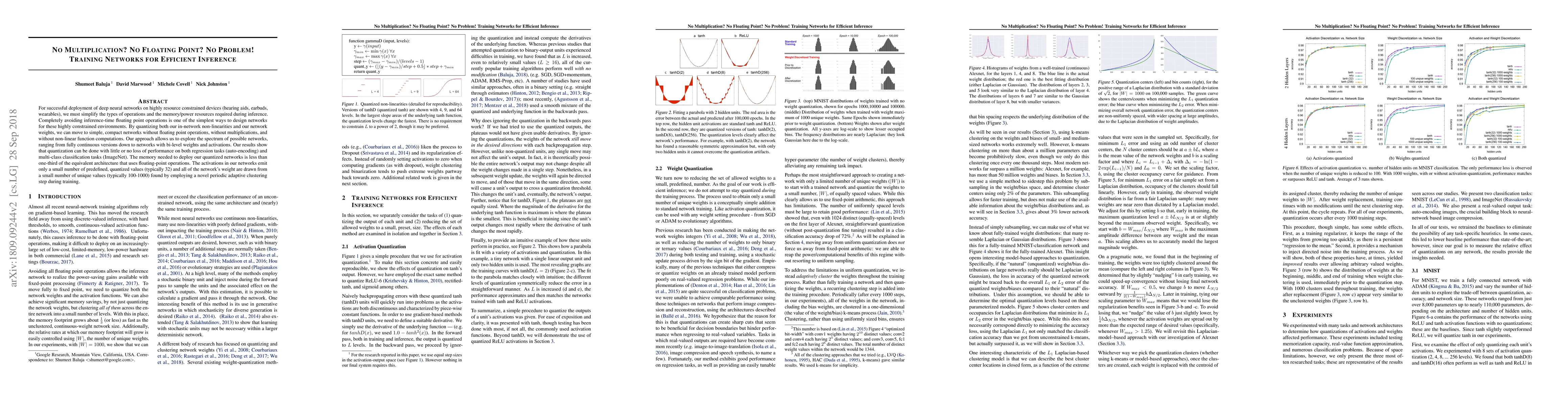 For successful deployment of deep neural networks on highly--resource-constrained devices (hearing aids, earbuds, wearables), we must simplify the types of operations and the memory/power resources used during inference. Completely avoiding inference-time floating-point operations is one of the simplest ways to design networks for these highly-constrained environments. By discretizing both our in-network non-linearities and our network weights, we can move to simple, compact networks without floating point operations, without multiplications, and avoid all non-linear function computations. Our approach allows us to explore the spectrum of possible networks, ranging from fully continuous versions down to networks with bi-level weights and activations. Our results show that discretization can be done without loss of performance and that we can train a network that will successfully operate without floating-point, without multiplication, and with less RAM on both regression tasks (auto encoding) and multi-class classification tasks (ImageNet). The memory needed to deploy our discretized networks is less than one third of the equivalent architecture that does use floating-point operations.
