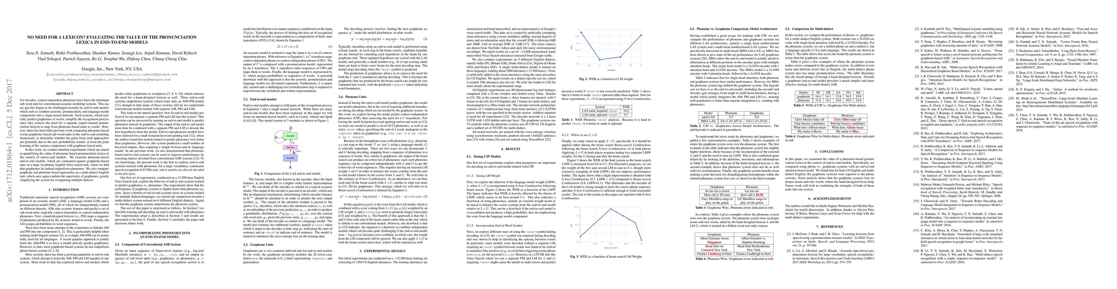 This paper evaluates the necessity of pronunciation lexica in end-to-end models, finding that grapheme-based units outperform phoneme-based units in both large vocabulary voice-search and multi-dialect English tasks, thus simplifying the recognition process.