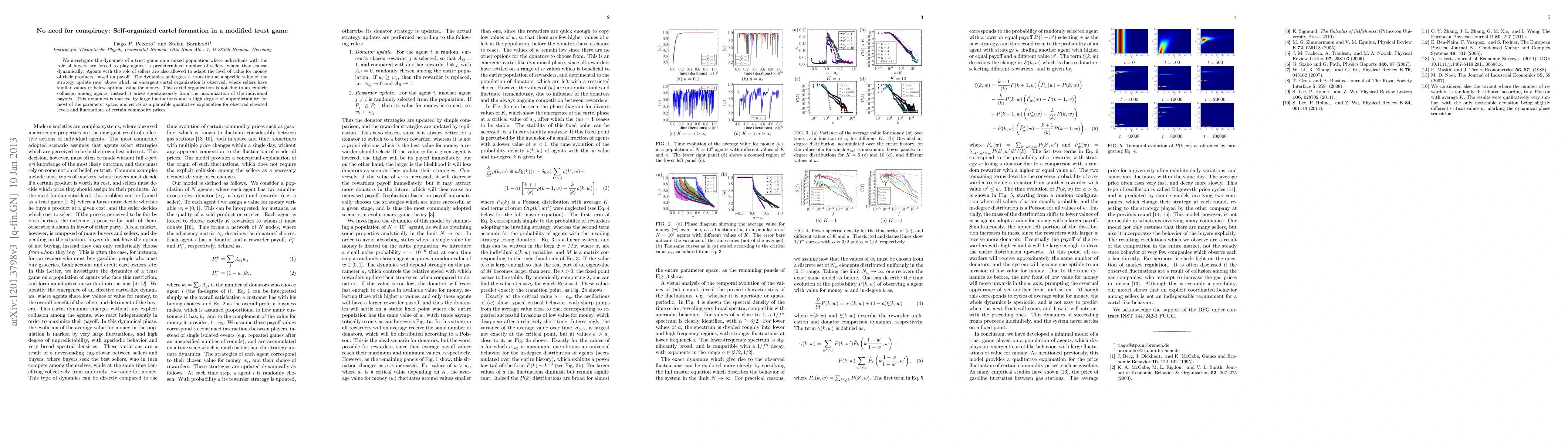 This study explores the emergence of self-organized cartels in a modified trust game where buyers and sellers dynamically interact. Above a certain strategy update rate, sellers spontaneously form cartels by setting below-optimal product values, leading to unpredictable price fluctuations, mirroring real-world commodity market dynamics.
