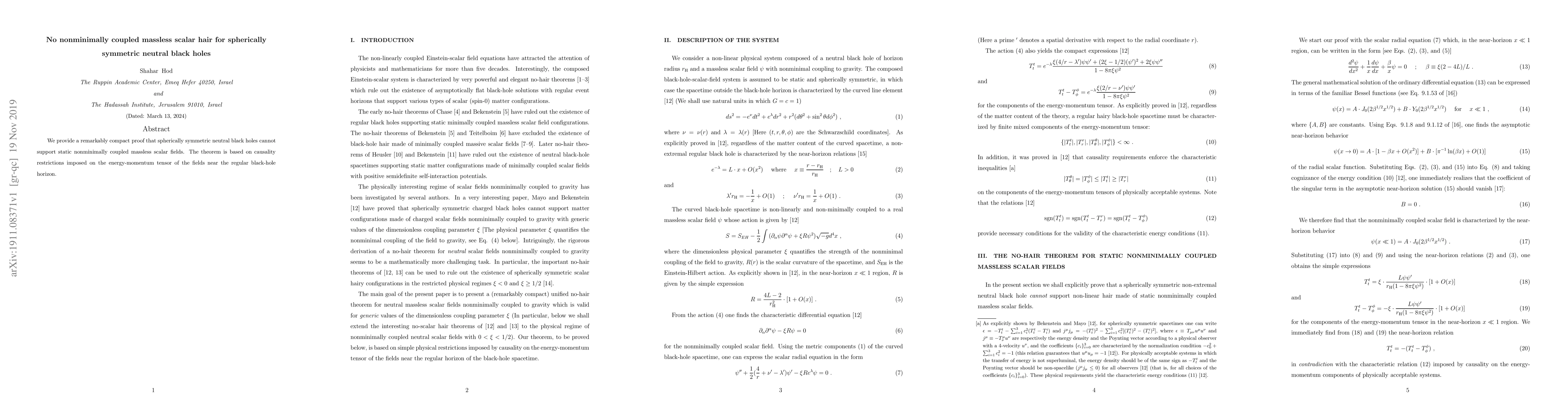 Summary: This paper proves that spherically symmetric neutral black holes cannot support static nonminimally coupled massless scalar fields, relying on causality constraints on the fields' energy-momentum tensor near the black hole horizon. The proof is notably concise.
