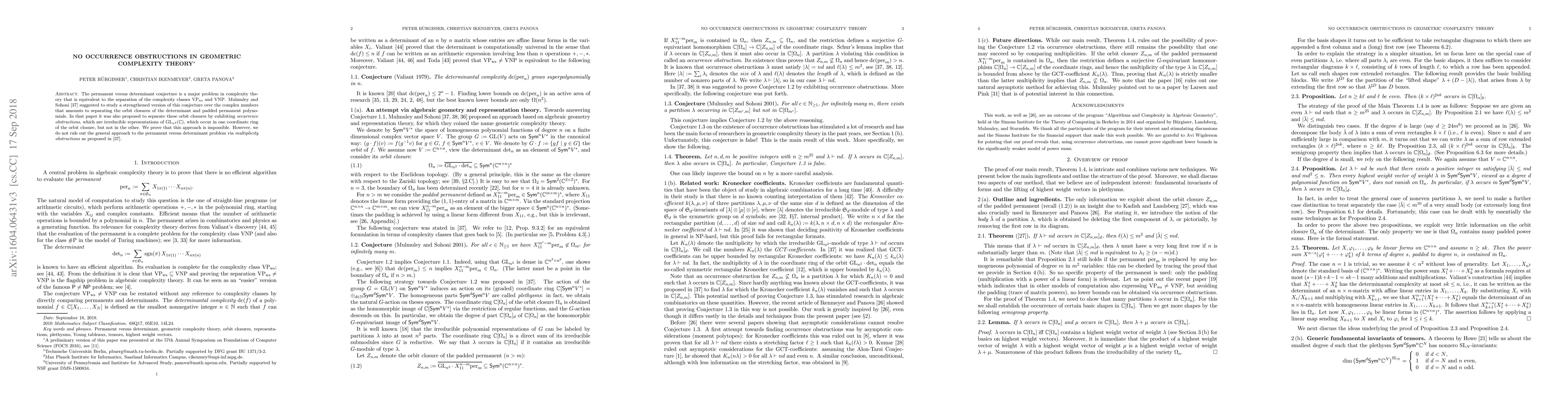 This paper demonstrates that occurrence obstructions cannot separate the orbit closures of the determinant and padded permanent polynomials in geometric complexity theory, thus invalidating a specific approach proposed by Mulmuley and Sohoni. It remains open to explore the permanent versus determinant problem using multiplicity obstructions.