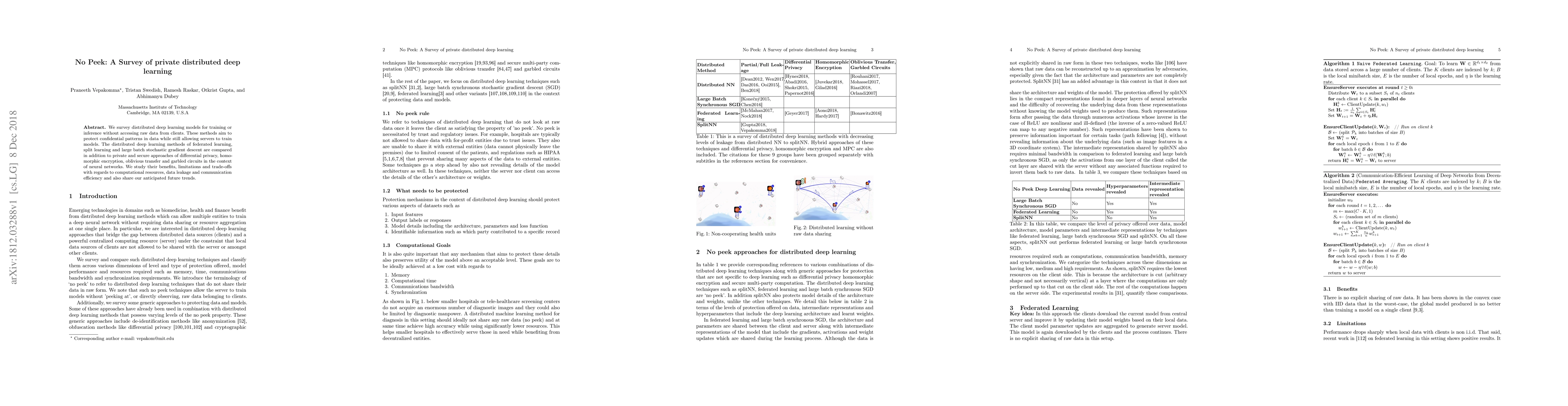 We survey distributed deep learning models for training or inference without accessing raw data from clients. These methods aim to protect confidential patterns in data while still allowing servers to train models. The distributed deep learning methods of federated learning, split learning and large batch stochastic gradient descent are compared in addition to private and secure approaches of differential privacy, homomorphic encryption, oblivious transfer and garbled circuits in the context of neural networks. We study their benefits, limitations and trade-offs with regards to computational resources, data leakage and communication efficiency and also share our anticipated future trends.