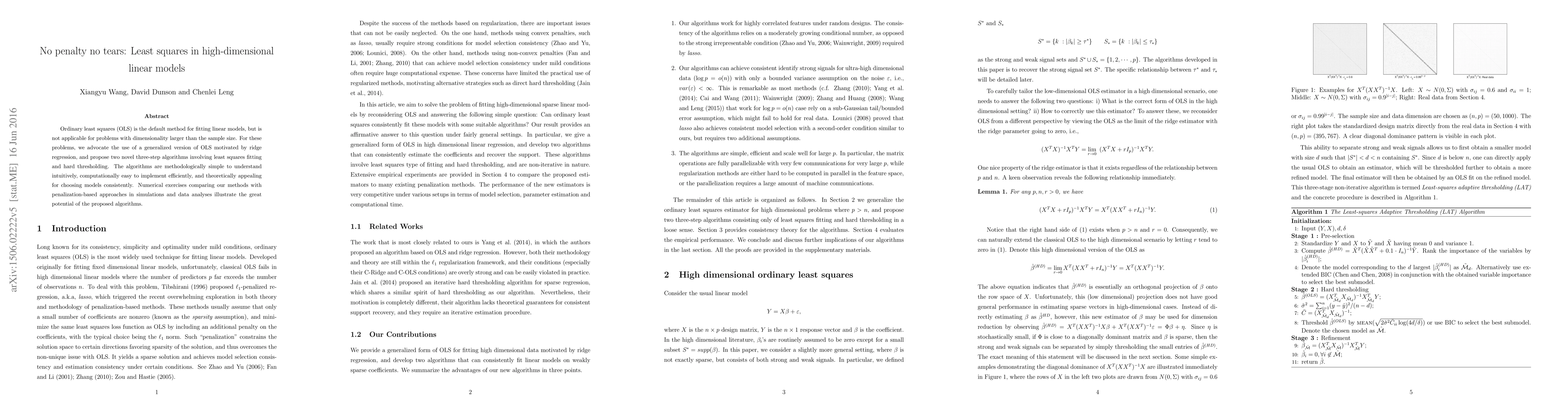 Ordinary least squares (OLS) is the default method for fitting linear models, but is not applicable for problems with dimensionality larger than the sample size. For these problems, we advocate the use of a generalized version of OLS motivated by ridge regression, and propose two novel three-step algorithms involving least squares fitting and hard thresholding. The algorithms are methodologically simple to understand intuitively, computationally easy to implement efficiently, and theoretically appealing for choosing models consistently. Numerical exercises comparing our methods with penalization-based approaches in simulations and data analyses illustrate the great potential of the proposed algorithms.