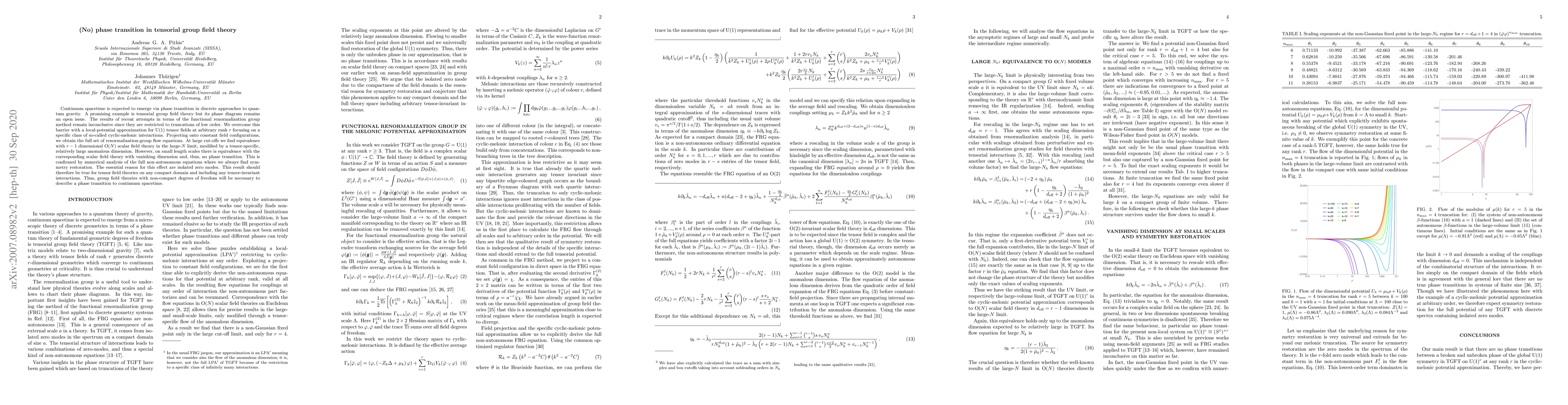 The study reveals that tensorial group field theory does not exhibit a phase transition to continuum spacetime, as isolated zero modes prevent symmetry restoration on small scales. This finding suggests that group field theories with non-compact degrees of freedom are required to describe such a phase transition.