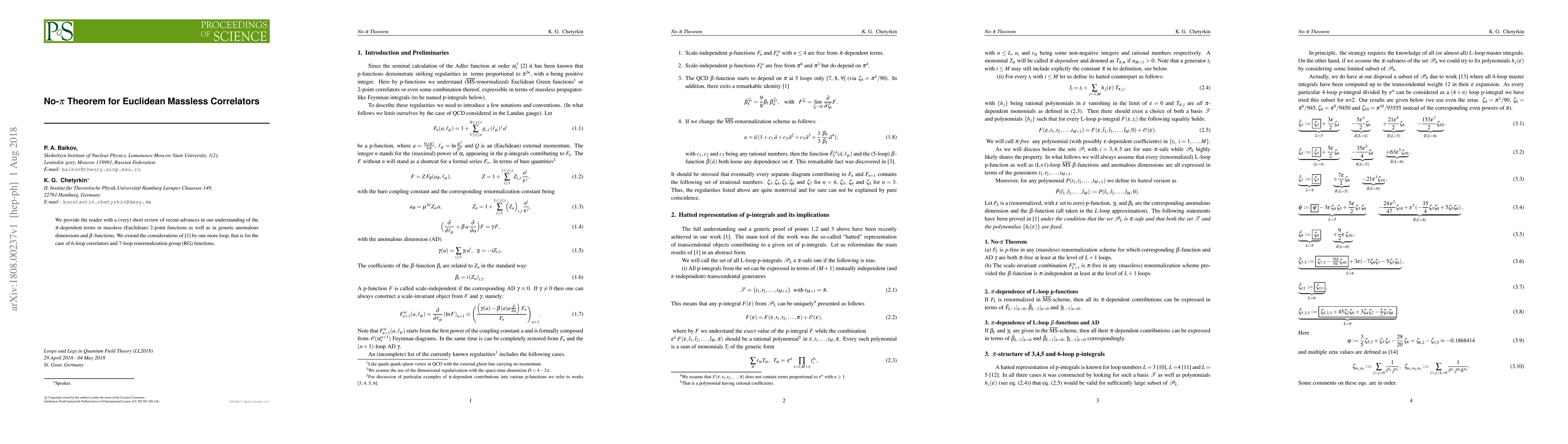 We provide the reader with a (very) short review of recent advances in our understanding of the $\pi$-dependent terms in massless (Euclidean) 2-point functions as well as in generic anomalous dimensions and $\beta$-functions. We extend the considerations of [1] by one more loop, that is for the case of 6-loop correlators and 7-loop renormalization group (RG) functions.