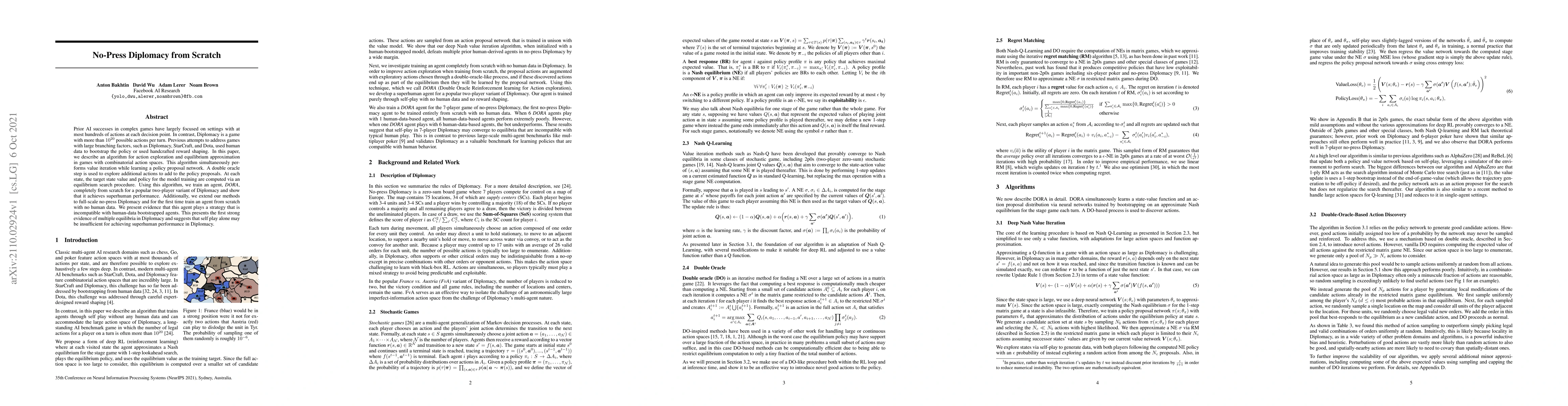 This paper introduces an algorithm for exploring large action spaces in games like Diplomacy, training an agent from scratch without human data. The agent, DORA, achieves superhuman performance in a two-player variant and demonstrates a strategy distinct from those informed by human data, suggesting multiple equilibria in Diplomacy.