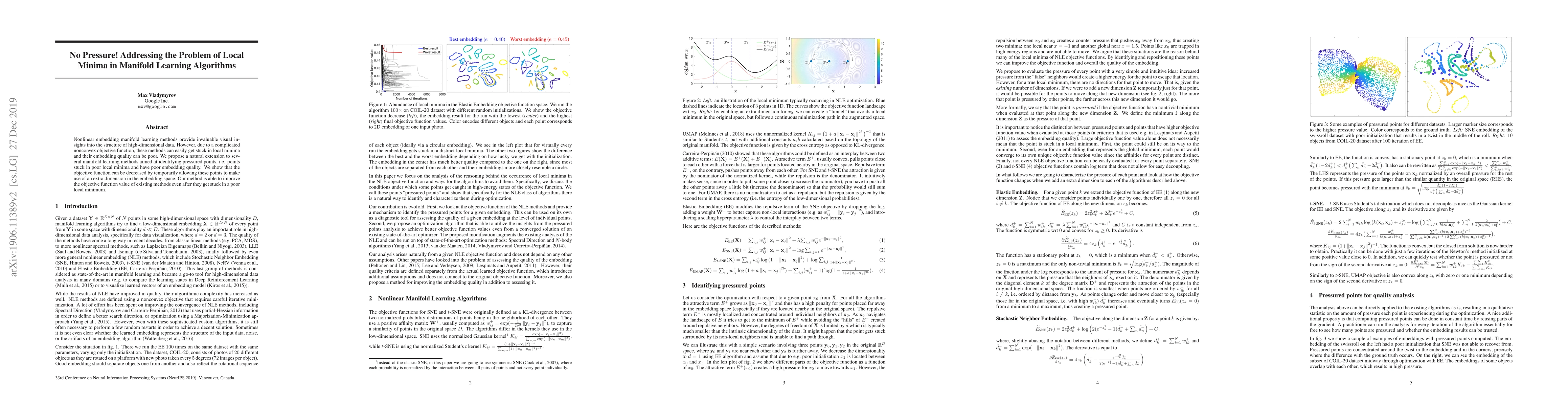 Nonlinear embedding manifold learning methods provide invaluable visual insights into the structure of high-dimensional data. However, due to a complicated nonconvex objective function, these methods can easily get stuck in local minima and their embedding quality can be poor. We propose a natural extension to several manifold learning methods aimed at identifying pressured points, i.e. points stuck in poor local minima and have poor embedding quality. We show that the objective function can be decreased by temporarily allowing these points to make use of an extra dimension in the embedding space. Our method is able to improve the objective function value of existing methods even after they get stuck in a poor local minimum.
