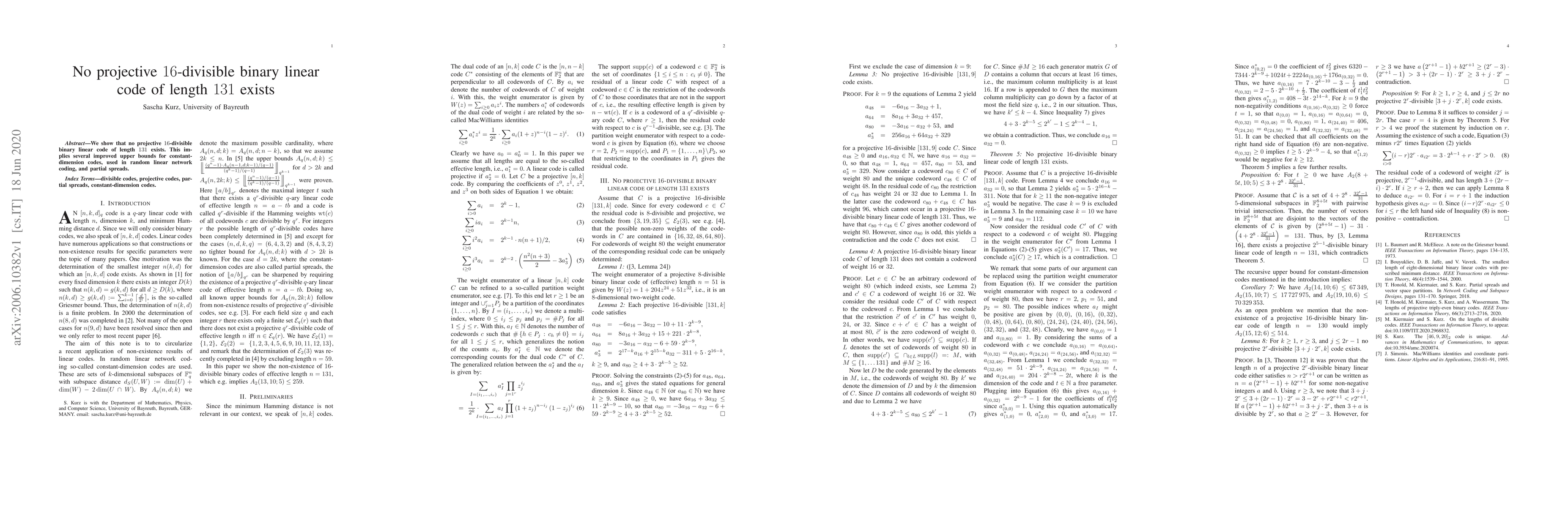 Researchers have proven that there is no projective 16-divisible binary linear code of length 131, providing new upper bounds for constant-dimension codes in random linear network coding and partial spreads.