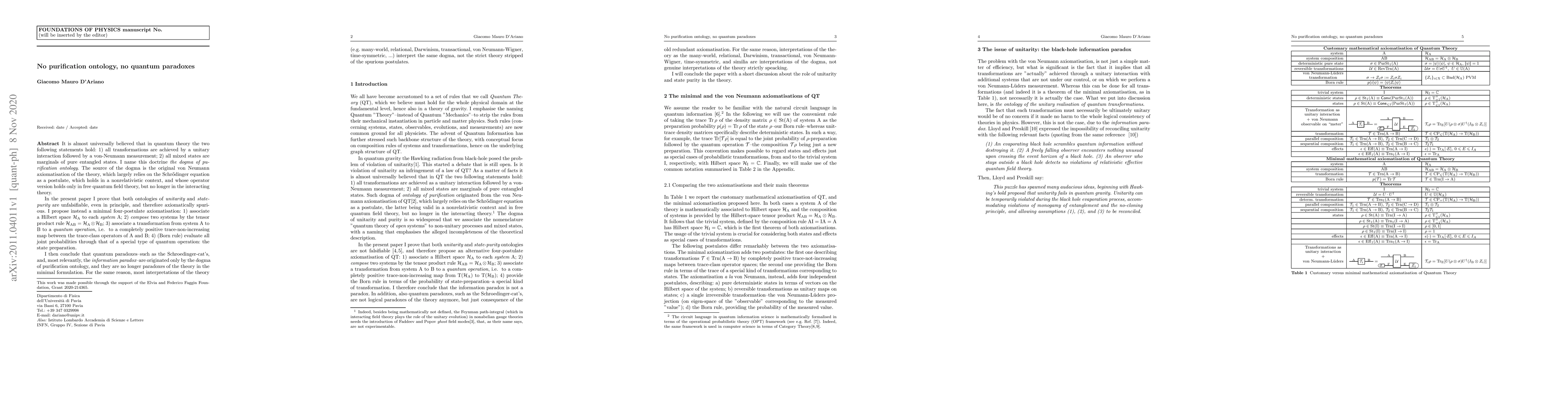 It is almost universally believed that in quantum theory the two following statements hold: 1) all transformations are achieved by a unitary interaction followed by a von Neumann measurement; 2) all mixed states are marginals of pure entangled states. I name this doctrine the dogma of purification ontology. The source of the dogma is the original von Neumann axiomatisation of the theory, which largely relies on the Schroedinger equation as a postulate, which holds in a nonrelativistic context, and whose operator version holds only in free quantum field theory, but no longer in the interacting theory. In the present paper I prove that both ontologies of unitarity and state purity are unfalsifiable, even in principle, and therefore axiomatically spurious. I propose instead a minimal four-postulate axiomatisation: 1) associate a Hilbert space HA to each system A; 2) compose two systems by the tensor product rule HAB = HAxHB; 3) associate a transformation from system A to B to a quantum operation, i.e. to a completely positive trace-non-increasing map between the trace-class operators of A and B; 4) (Born rule) evaluate all joint probabilities through that of a special type of quantum operation: the state preparation. I then conclude that quantum paradoxes-such as the Schroedinger-cat's, and, most relevantly, the information paradox-are originated only by the dogma of purification ontology, and they are no longer paradoxes of the theory in the minimal formulation. For the same reason, most interpretations of the theory (e.g. many-world, relational, Darwinism, transactional, von Neumann-Wigner, time-symmetric, ...) interpret the same dogma, not the strict theory stripped of the spurious postulates.