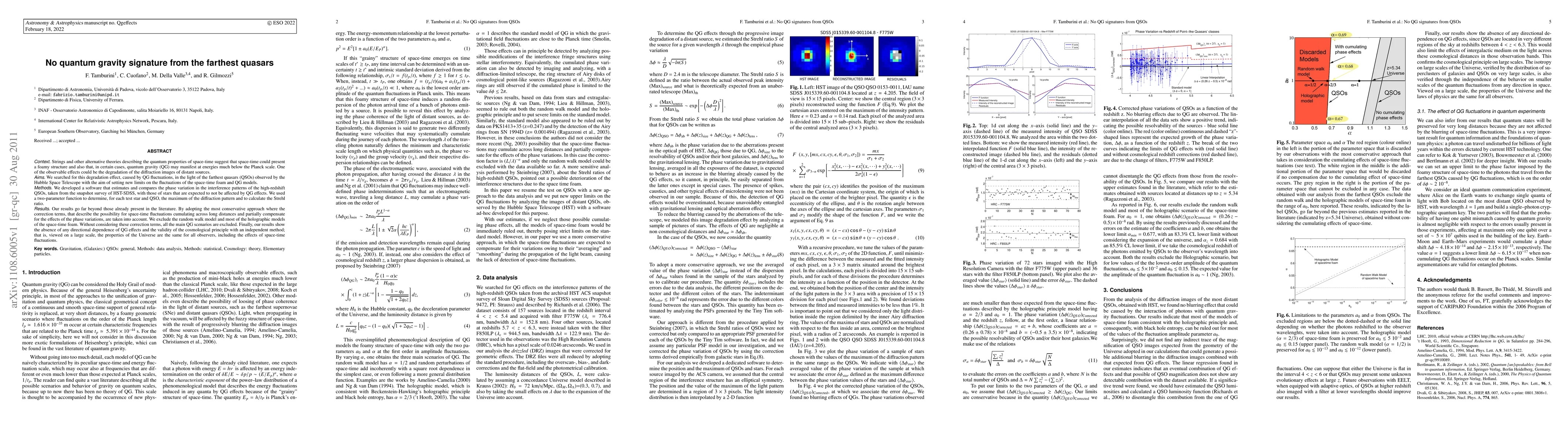 Context: Strings and other alternative theories describing the quantum properties of space-time suggest that space-time could present a foamy structure and also that, in certain cases, quantum gravity (QG) may manifest at energies much below the Planck scale. One of the observable effects could be the degradation of the diffraction images of distant sources. Aims: We searched for this degradation effect, caused by QG fluctuations, in the light of the farthest quasars (QSOs) observed by the Hubble Space Telescope with the aim of setting new limits on the fluctuations of the space-time foam and QG models. Methods: We developed a software that estimates and compares the phase variation in the interference patterns of the high-redshift QSOs, taken from the snapshot survey of HST-SDSS, with those of stars that are expected to not be affected by QG effects. We used a two-parameter function to determine, for each test star and QSO, the maximum of the diffraction pattern and to calculate the Strehl ratio. Results: Our results go far beyond those already present in the literature. By adopting the most conservative approach where the correction terms, that describe the possibility for space-time fluctuations cumulating across long distances and partially compensate for the effects of the phase variations, are taken into account. We exclude the random walk model and most of the holographic models of the space-time foam. Without considering these correction terms, all the main QG scenarios are excluded. Finally, our results show the absence of any directional dependence of QG effects and the validity of the cosmological principle with an independent method; that is, viewed on a large scale, the properties of the Universe are the same for all observers, including the effects of space-time fluctuations.