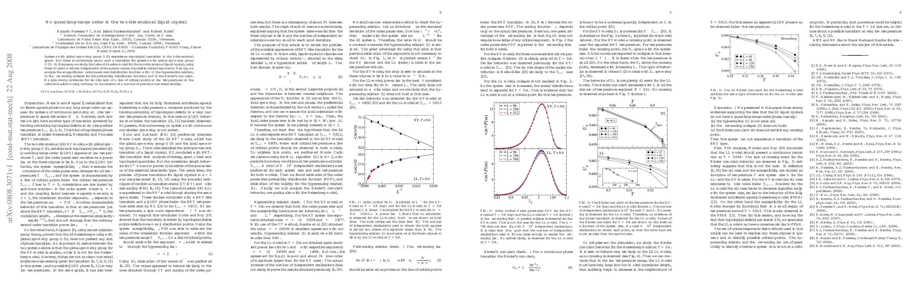 Systems with global symmetry group O(2) experience topological transition in the 2-dimensional space. But there is controversy about such a transition for systems with global symmetry group O(3). In this paper, we study the Lebwohl-Lasher model for the two-dimensional liquid crystal, using three different methods independent of the proper values of possible critical exponents. Namely, we analyze the at-equilibrium order parameter distribution function with: 1) the hyperscaling relation; 2) the first scaling collapse for the probability distribution function;and 3) the Binder's cumulant. We give strong evidences for definite lack of a line of critical points at low temperatures in the Lebwohl-Lasher model, contrary to conclusions of a number of previous numerical studies.