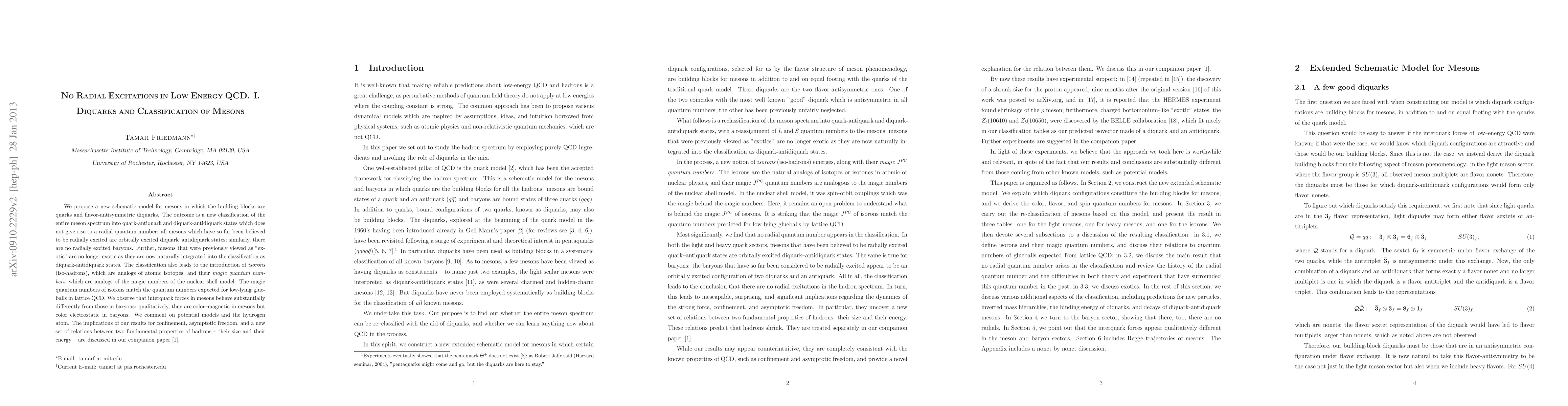 We propose a new schematic model for mesons in which the building blocks are quarks and flavor-antisymmetric diquarks. The outcome is a new classification of the entire meson spectrum into quark-antiquark and diquark-antidiquark states which does not give rise to a radial quantum number: all mesons which have so far been believed to be radially excited are orbitally excited diquark-antidiquark states; similarly, there are no radially excited baryons. Further, mesons that were previously viewed as "exotic" are no longer exotic as they are now naturally integrated into the classification as diquark-antidiquark states. The classification also leads to the introduction of isorons (iso-hadrons), which are analogs of atomic isotopes, and their magic quantum numbers, which are analogs of the magic numbers of the nuclear shell model. The magic quantum numbers of isorons match the quantum numbers expected for low-lying glueballs in lattice QCD. We observe that interquark forces in mesons behave substantially differently from those in baryons: qualitatively, they are color-magnetic in mesons but color-electrostatic in baryons. We comment on potential models and the hydrogen atom. The implications of our results for confinement, asymptotic freedom, and a new set of relations between two fundamental properties of hadrons - their size and their energy - are discussed in our companion paper [arXiv:0910.2231].