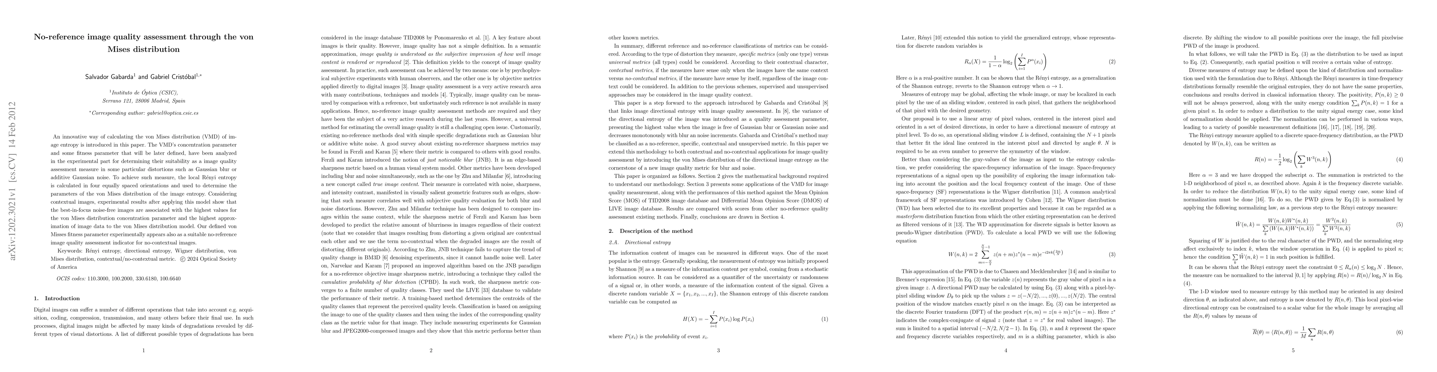 An innovative way of calculating the von Mises distribution (VMD) of image entropy is introduced in this paper. The VMD's concentration parameter and some fitness parameter that will be later defined, have been analyzed in the experimental part for determining their suitability as a image quality assessment measure in some particular distortions such as Gaussian blur or additive Gaussian noise. To achieve such measure, the local R\'{e}nyi entropy is calculated in four equally spaced orientations and used to determine the parameters of the von Mises distribution of the image entropy. Considering contextual images, experimental results after applying this model show that the best-in-focus noise-free images are associated with the highest values for the von Mises distribution concentration parameter and the highest approximation of image data to the von Mises distribution model. Our defined von Misses fitness parameter experimentally appears also as a suitable no-reference image quality assessment indicator for no-contextual images.