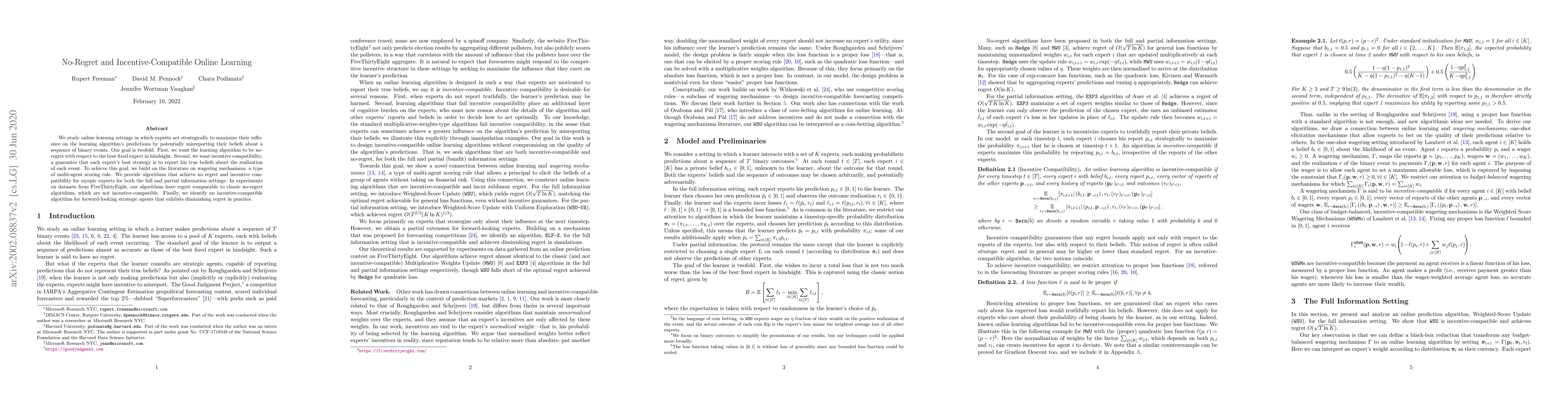 This paper explores online learning algorithms that are both no-regret and incentive-compatible, addressing strategic misreporting by experts. It presents algorithms that achieve these goals for both myopic and forward-looking experts, demonstrating comparable performance in experiments.