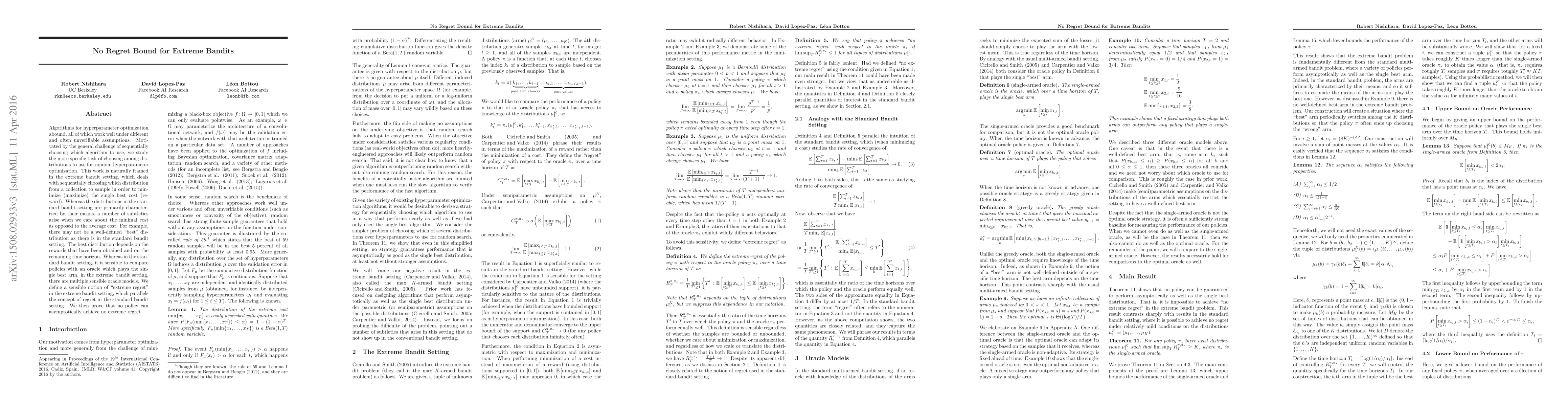 Algorithms for hyperparameter optimization abound, all of which work well under different and often unverifiable assumptions. Motivated by the general challenge of sequentially choosing which algorithm to use, we study the more specific task of choosing among distributions to use for random hyperparameter optimization. This work is naturally framed in the extreme bandit setting, which deals with sequentially choosing which distribution from a collection to sample in order to minimize (maximize) the single best cost (reward). Whereas the distributions in the standard bandit setting are primarily characterized by their means, a number of subtleties arise when we care about the minimal cost as opposed to the average cost. For example, there may not be a well-defined "best" distribution as there is in the standard bandit setting. The best distribution depends on the rewards that have been obtained and on the remaining time horizon. Whereas in the standard bandit setting, it is sensible to compare policies with an oracle which plays the single best arm, in the extreme bandit setting, there are multiple sensible oracle models. We define a sensible notion of "extreme regret" in the extreme bandit setting, which parallels the concept of regret in the standard bandit setting. We then prove that no policy can asymptotically achieve no extreme regret.