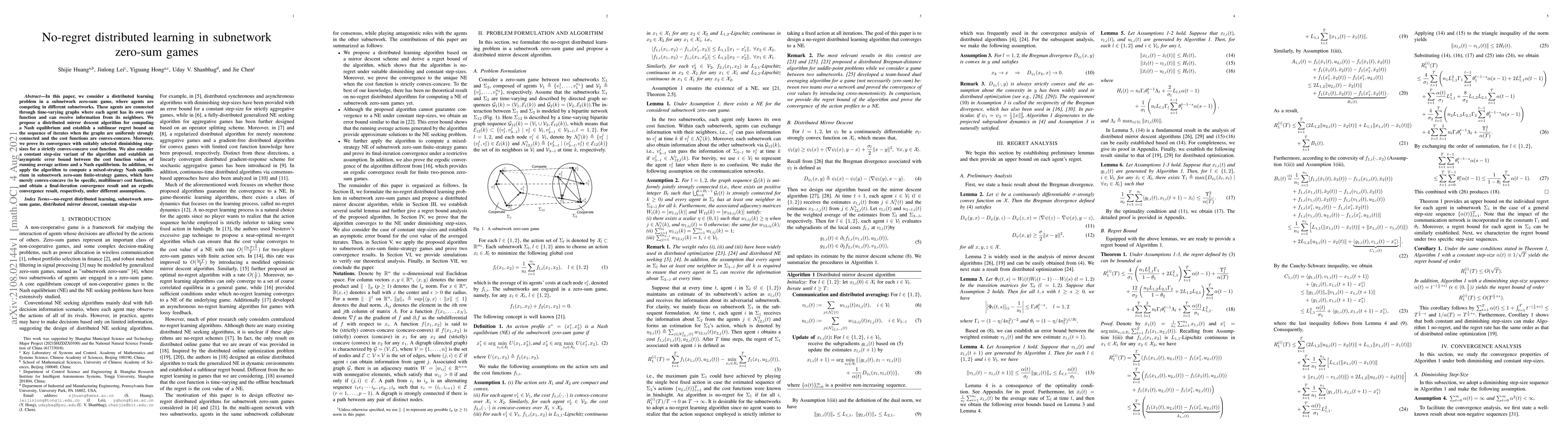 Researchers develop a distributed mirror descent algorithm for learning Nash equilibria in subnetwork zero-sum games with convex-concave cost functions. The algorithm achieves sublinear regret bounds and convergence results under different assumptions.