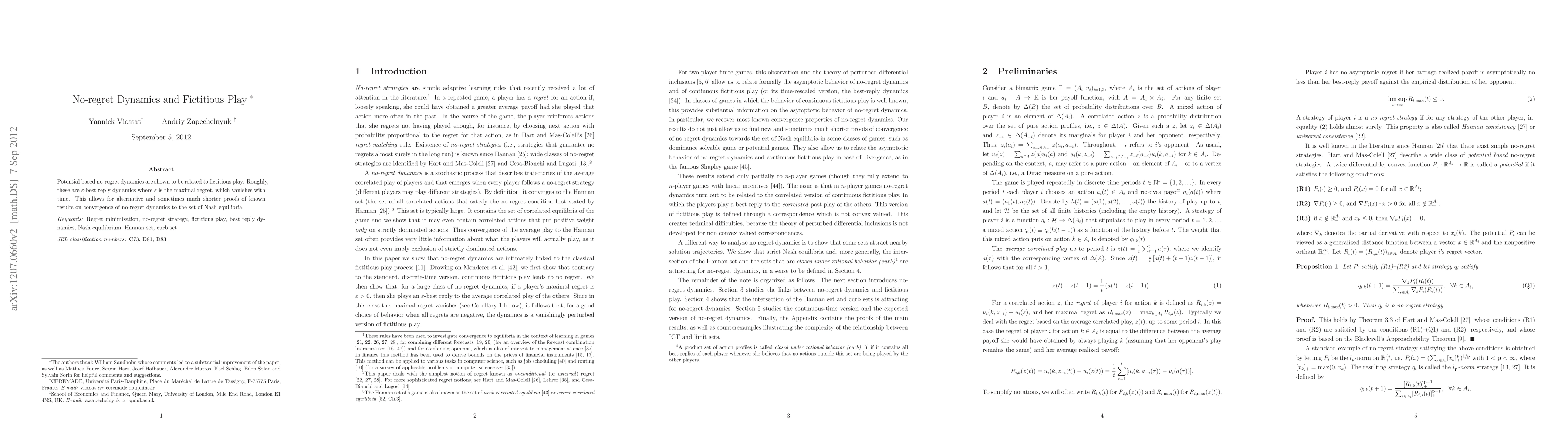 Summary: This paper explores the relationship between no-regret dynamics and fictitious play, demonstrating that the former can lead to convergence to Nash equilibria, providing alternative and often more concise proofs for known results. The focus is on epsilon-best reply dynamics where regret diminishes over time.