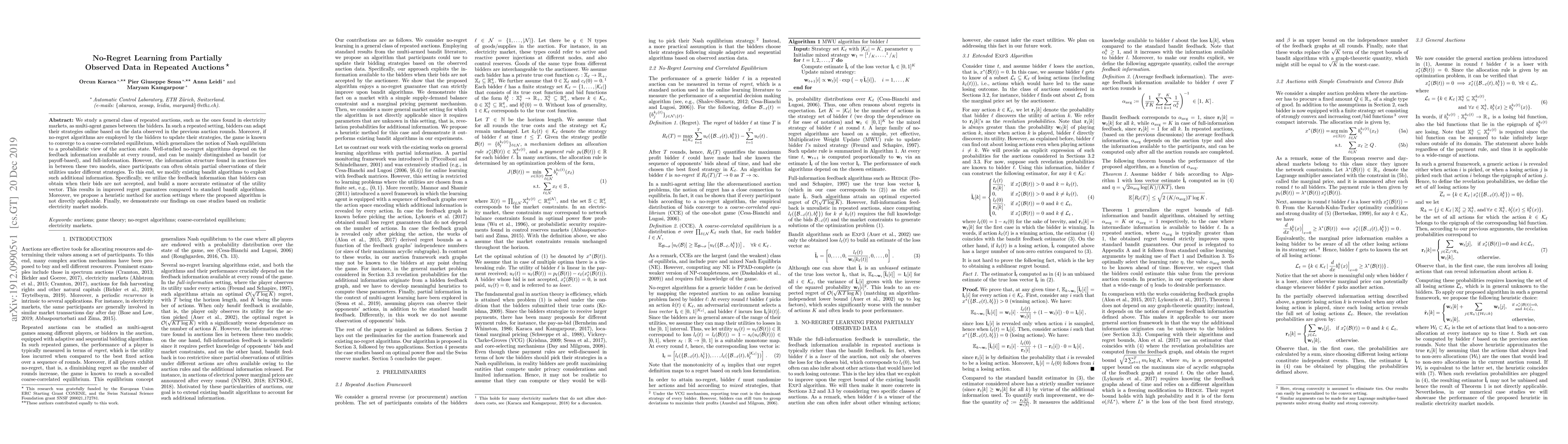 We study a general class of repeated auctions, such as the ones found in electricity markets, as multi-agent games between the bidders. In such a repeated setting, bidders can adapt their strategies online based on the data observed in the previous auction rounds. Moreover, if no-regret algorithms are employed by the bidders to update their strategies, the game is known to converge to a coarse-correlated equilibrium, which generalizes the notion of Nash equilibrium to a probabilistic view of the auction state. Well-studied no-regret algorithms depend on the feedback information available at every round, and can be mainly distinguished as bandit (or payoff-based), and full-information. However, the information structure found in auctions lies in between these two models, since participants can often obtain partial observations of their utilities under different strategies. To this end, we modify existing bandit algorithms to exploit such additional information. Specifically, we utilize the feedback information that bidders can obtain when their bids are not accepted, and build a more accurate estimator of the utility vector. This results in improved regret guarantees compared to standard bandit algorithms. Moreover, we propose a heuristic method for auction settings where the proposed algorithm is not directly applicable. Finally, we demonstrate our findings on case studies based on realistic electricity market models.