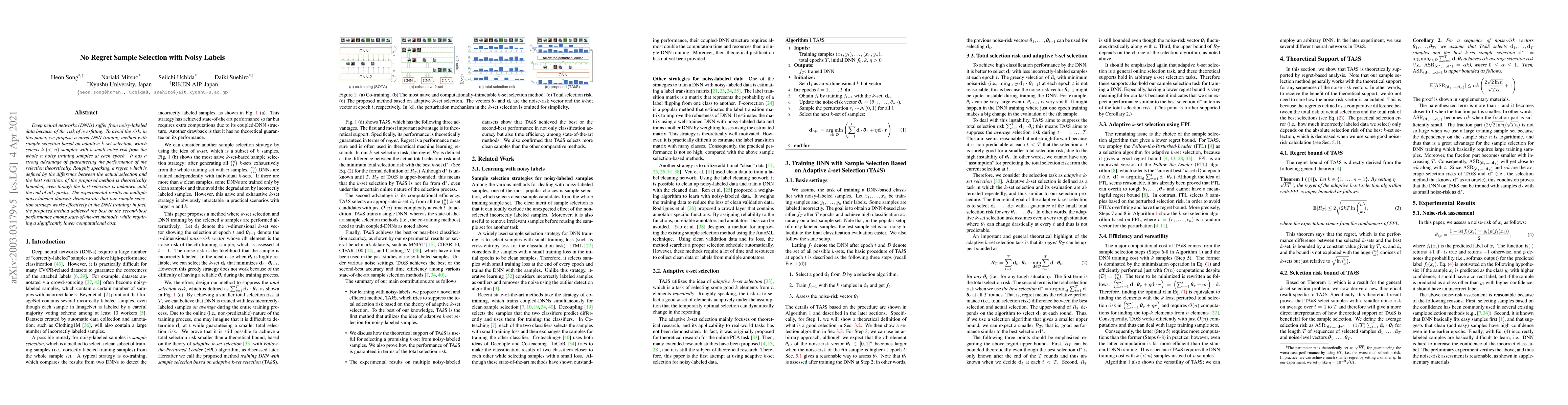 A new method for training deep neural networks with noisy labels is proposed, using adaptive k-set selection to guarantee performance without knowing the best selection, and achieving better results than state-of-the-art methods with lower computational cost.