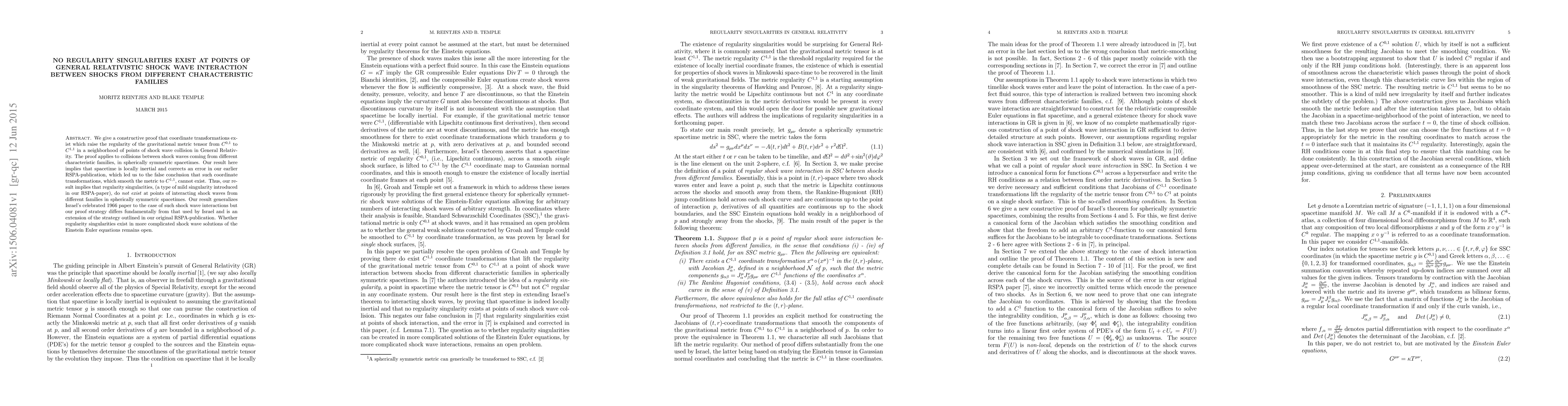 This paper proves the existence of coordinate transformations that raise the regularity of the gravitational metric tensor in regions where shock waves from different characteristic families collide in General Relativity, showing that regularity singularities do not exist in these interactions in spherically symmetric spacetimes. This corrects a previous error and extends Israel's 1966 work, though the existence of such singularities in more complex scenarios remains uncertain.