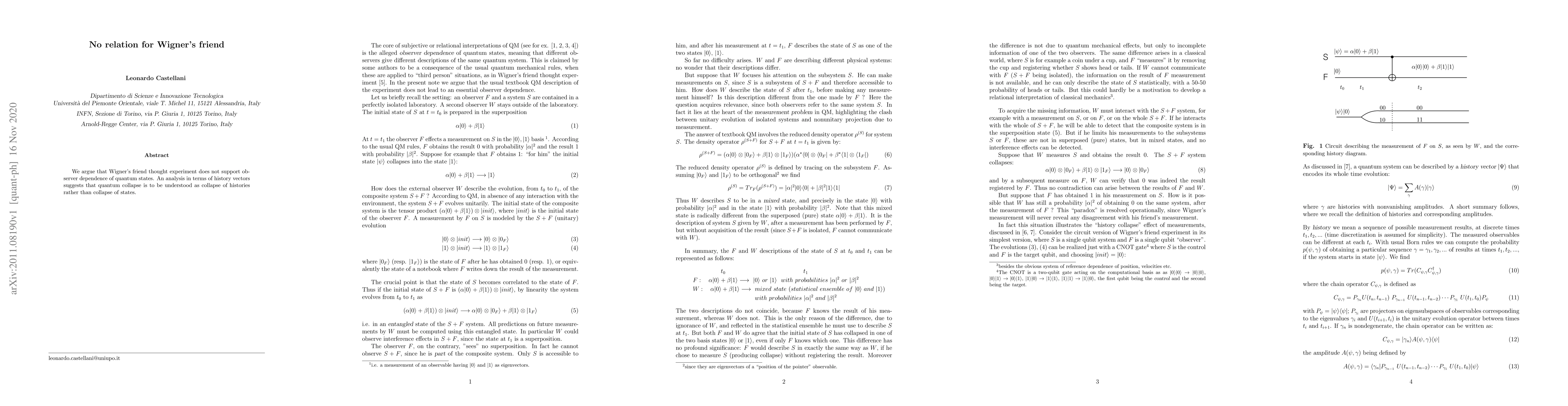Summary: The paper contends that Wigner's friend thought experiment does not validate observer dependence in quantum states, proposing instead that quantum collapse should be viewed as a collapse of histories rather than states.