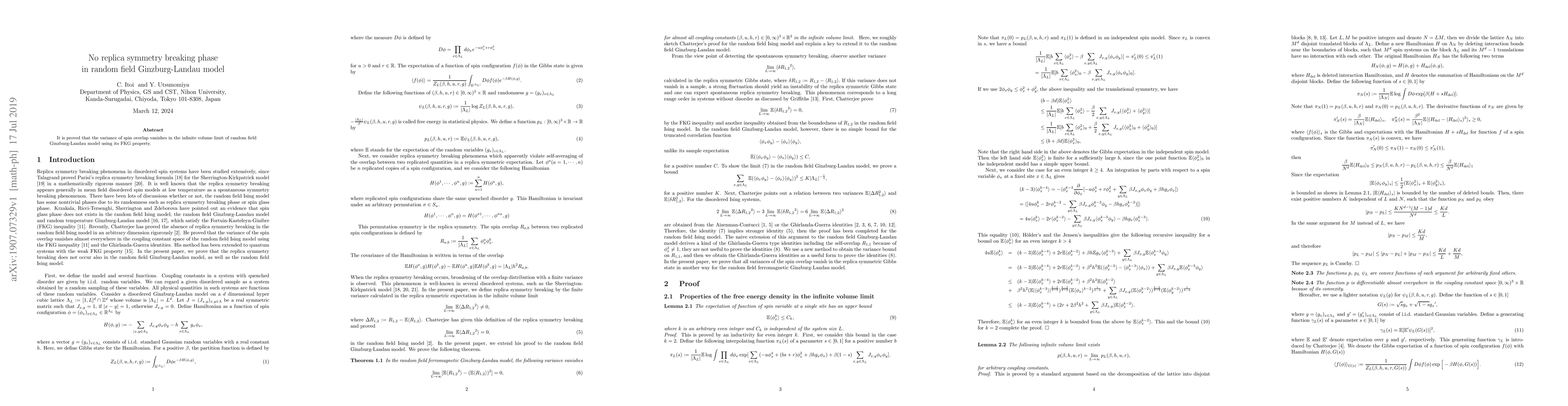 Summary: The paper demonstrates that the random field Ginzburg-Landau model does not exhibit replica symmetry breaking in the infinite volume limit, confirmed by utilizing its FKG property to show that the variance of spin overlap vanishes.