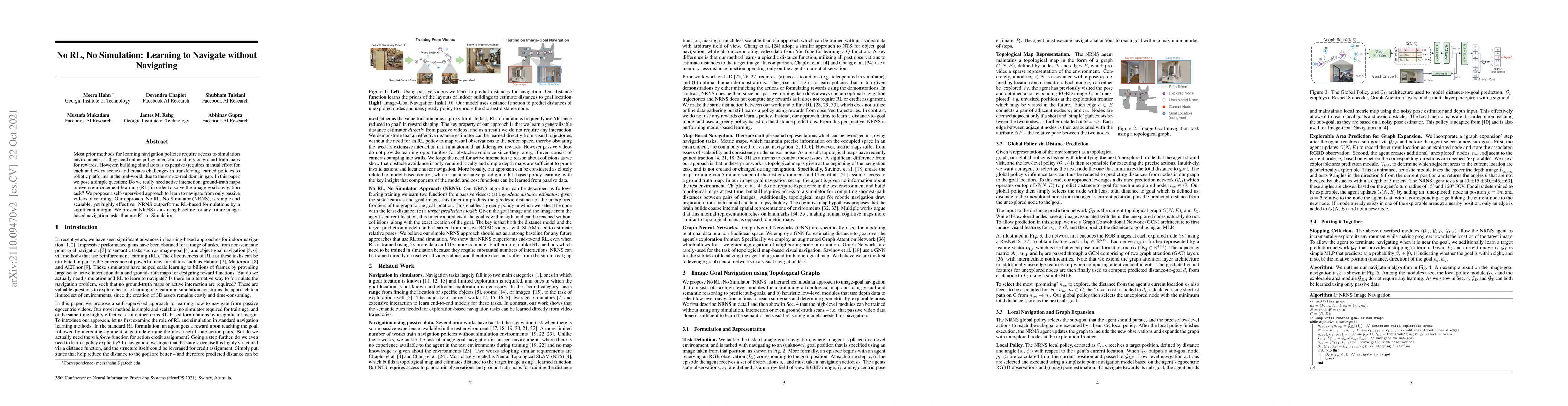 This paper proposes a self-supervised method, No RL, No Simulator (NRNS), to learn navigation from passive video data without active interaction, ground-truth maps, or reinforcement learning. NRNS outperforms traditional RL-based navigation methods, demonstrating its effectiveness and scalability for image-goal navigation tasks.